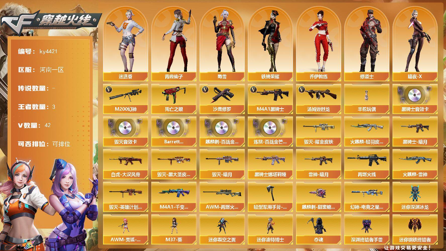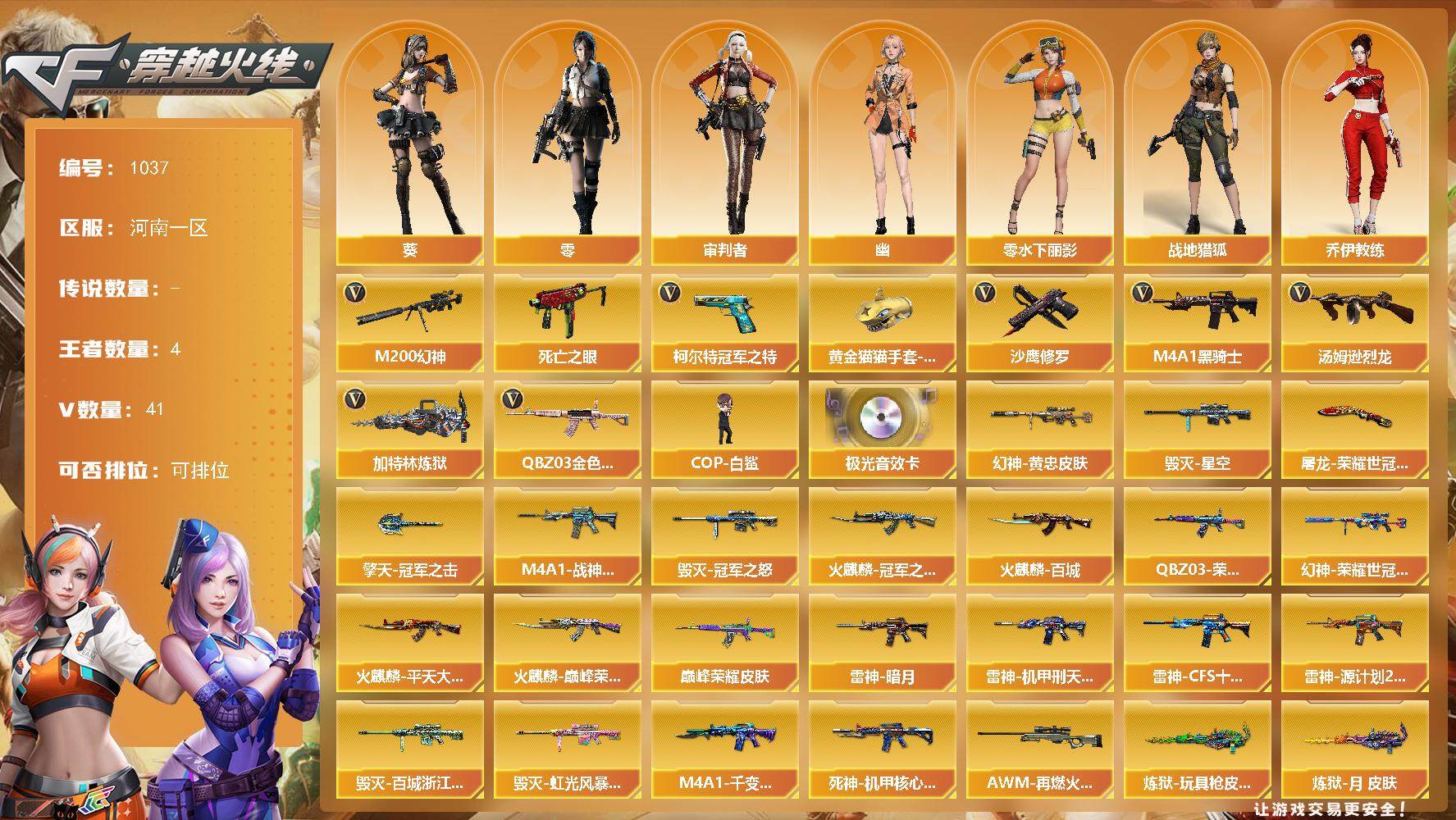 河南一区-42V-3王者-0炫金【热门武器】:M200-幻神,死亡之眼*2,