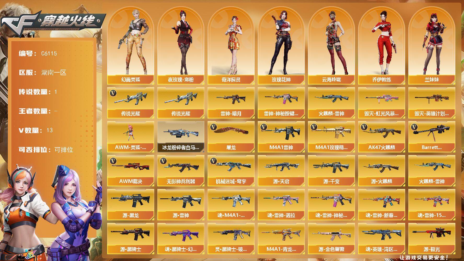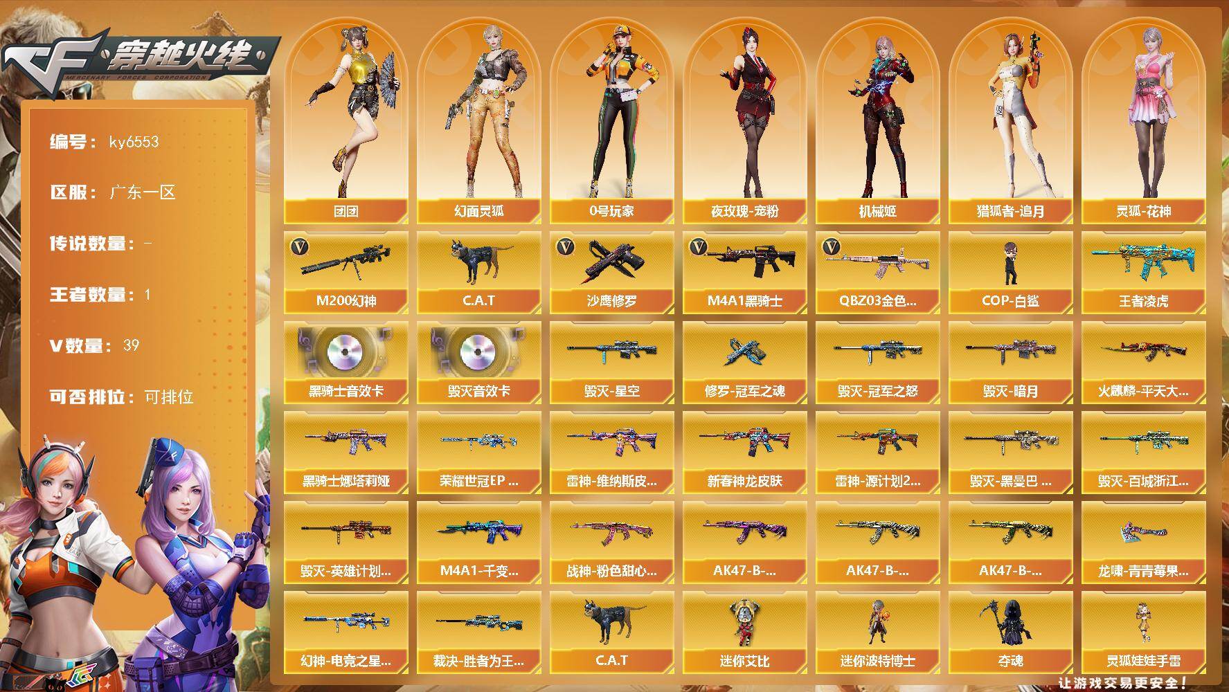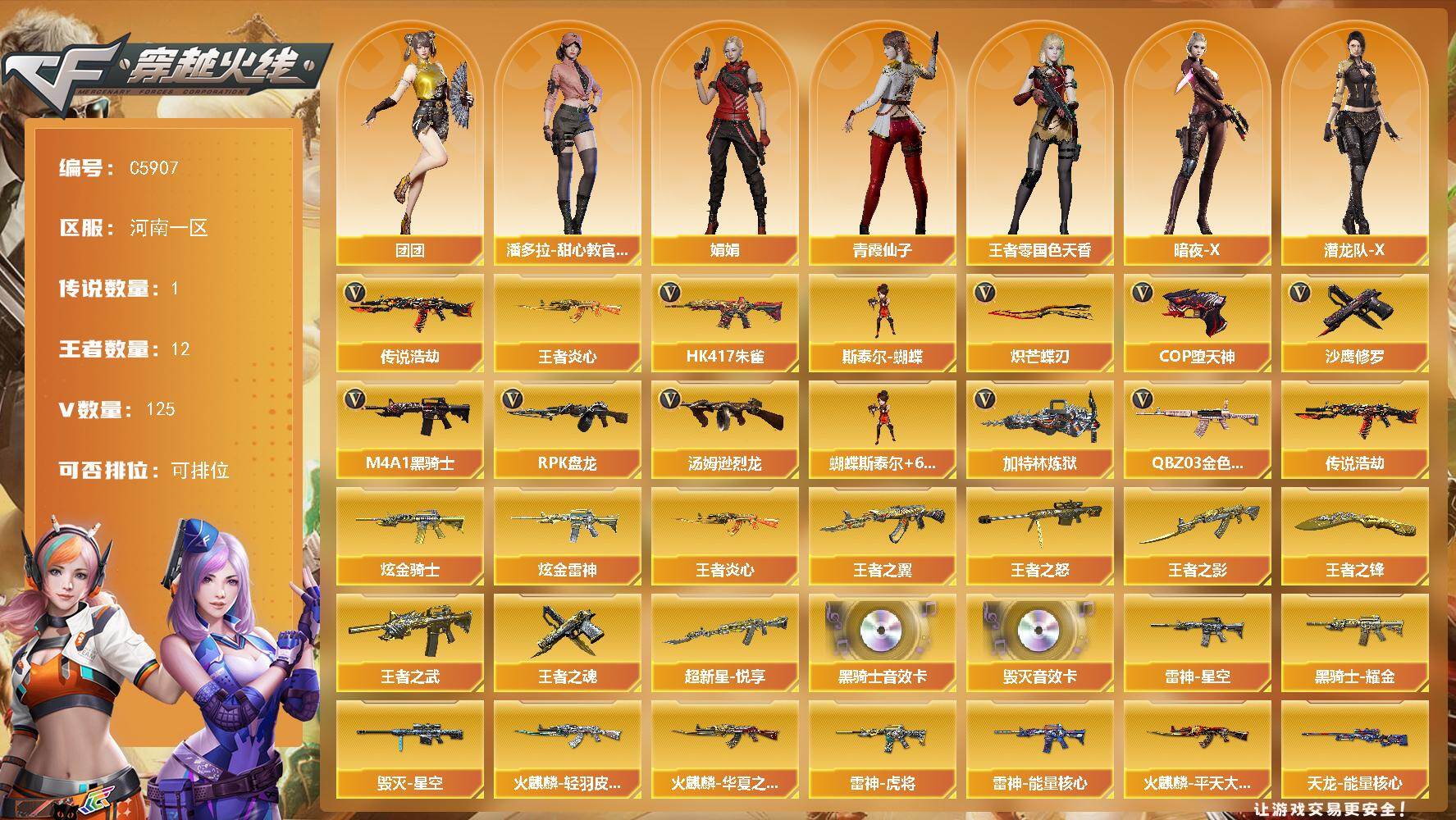 3传说武器 6王者武器 4炫金武器 209V武器 7V角色 44皮肤 可排位