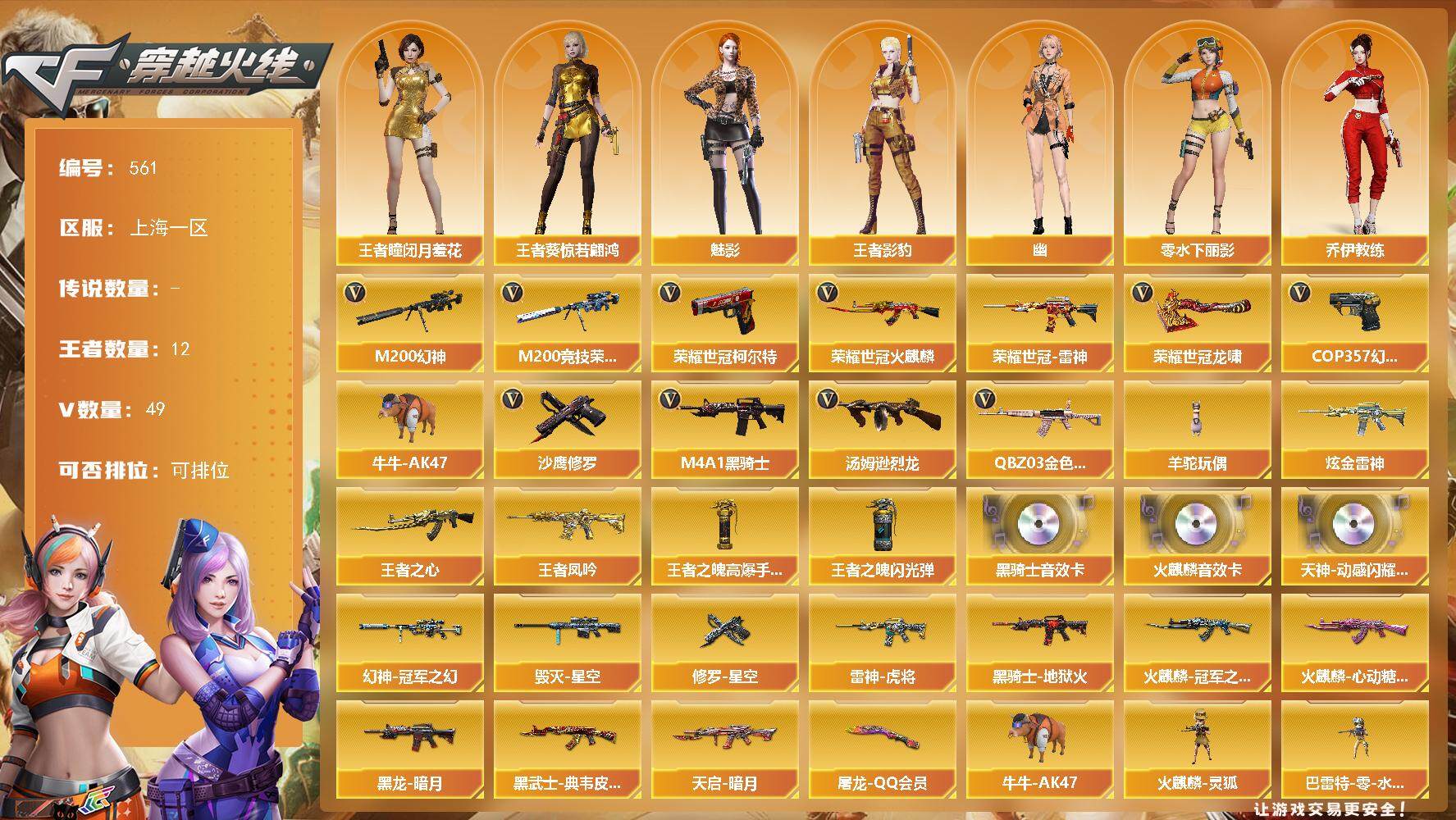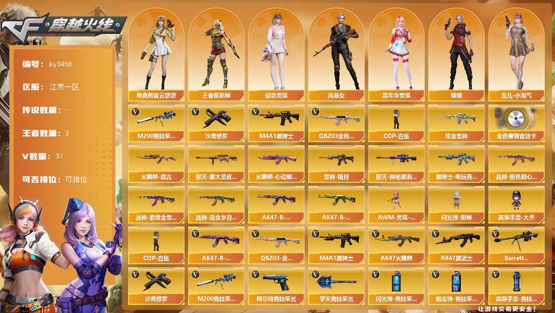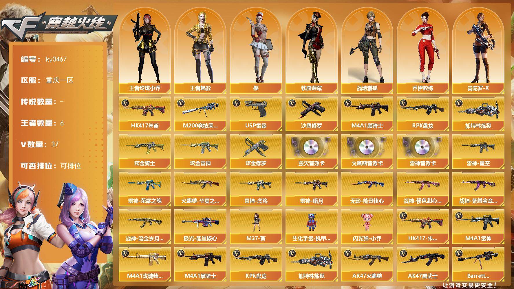 重庆一区-37V-6王者-3炫金 【热门武器】:HK417-朱雀,M200-竞