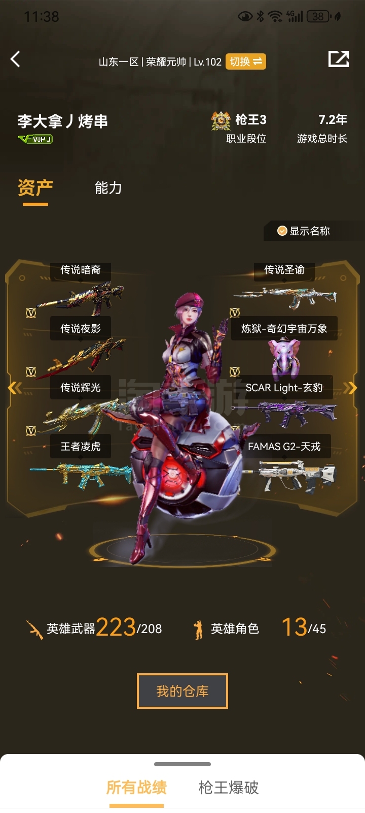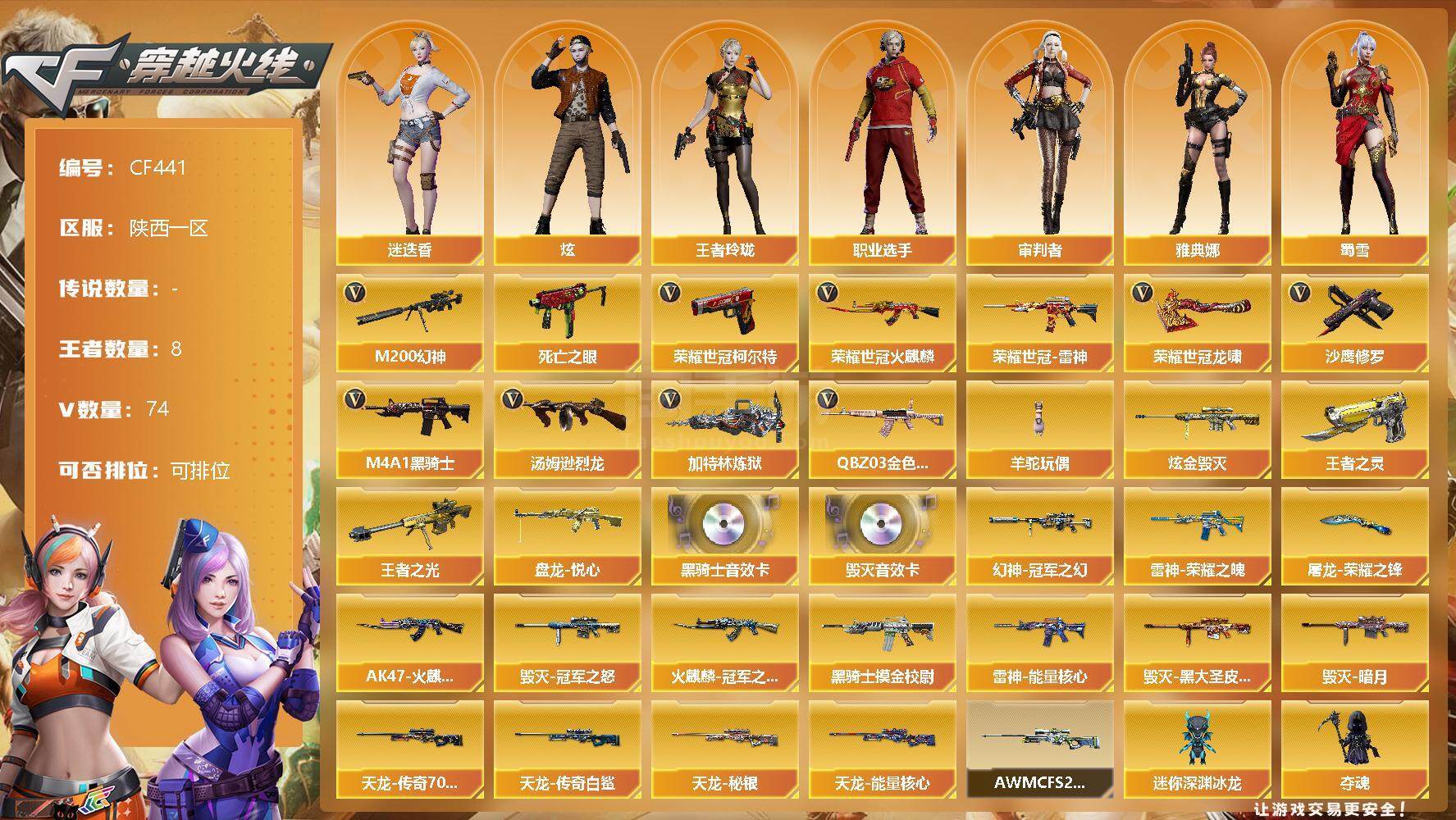 3王者武器 1炫金武器 72V武器 5V角色 13皮肤 可排位