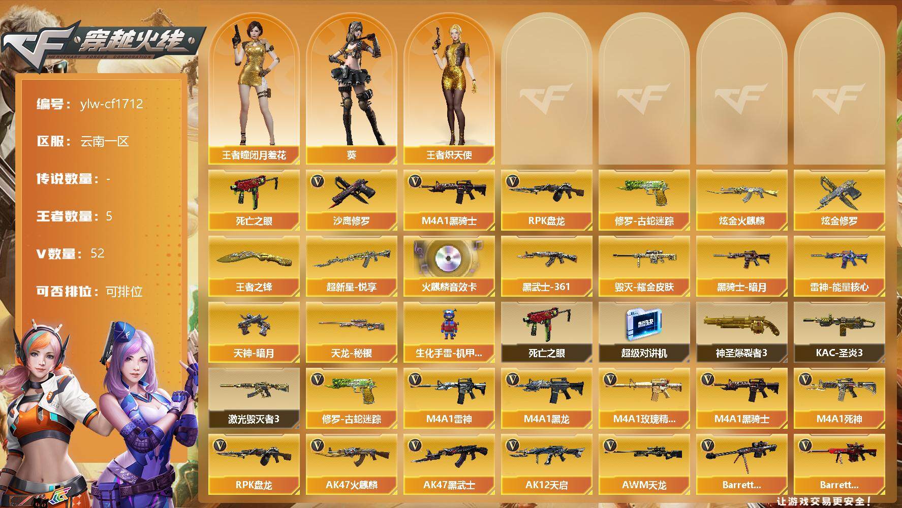 【商品标题】:云南一区-52V-5王者-3炫金 【热门武器】:修罗-古蛇迷踪,