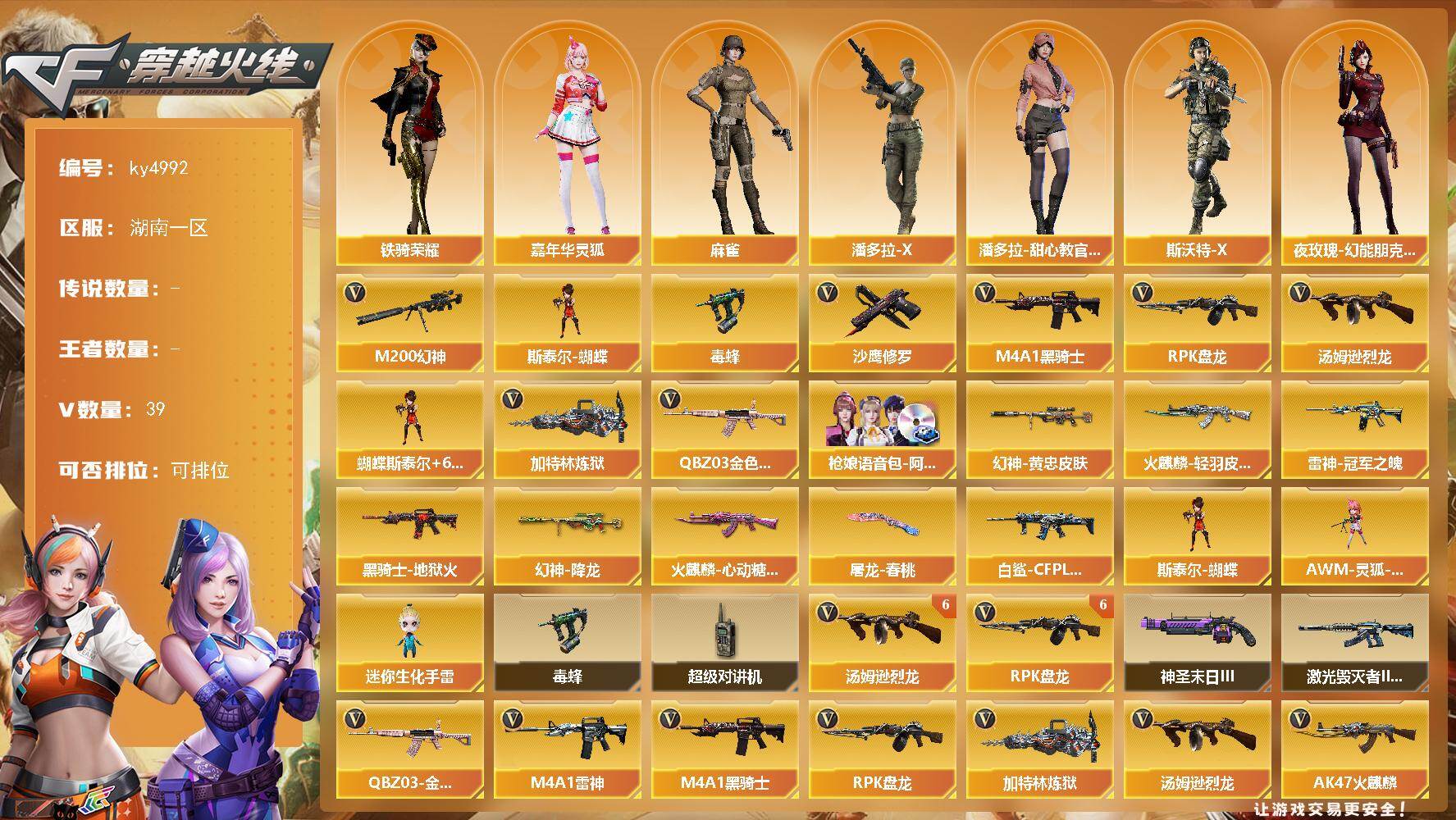 湖南一区-39V-0王者-0炫金【传说角色】:传说艾莉莎【热门武器】:QB