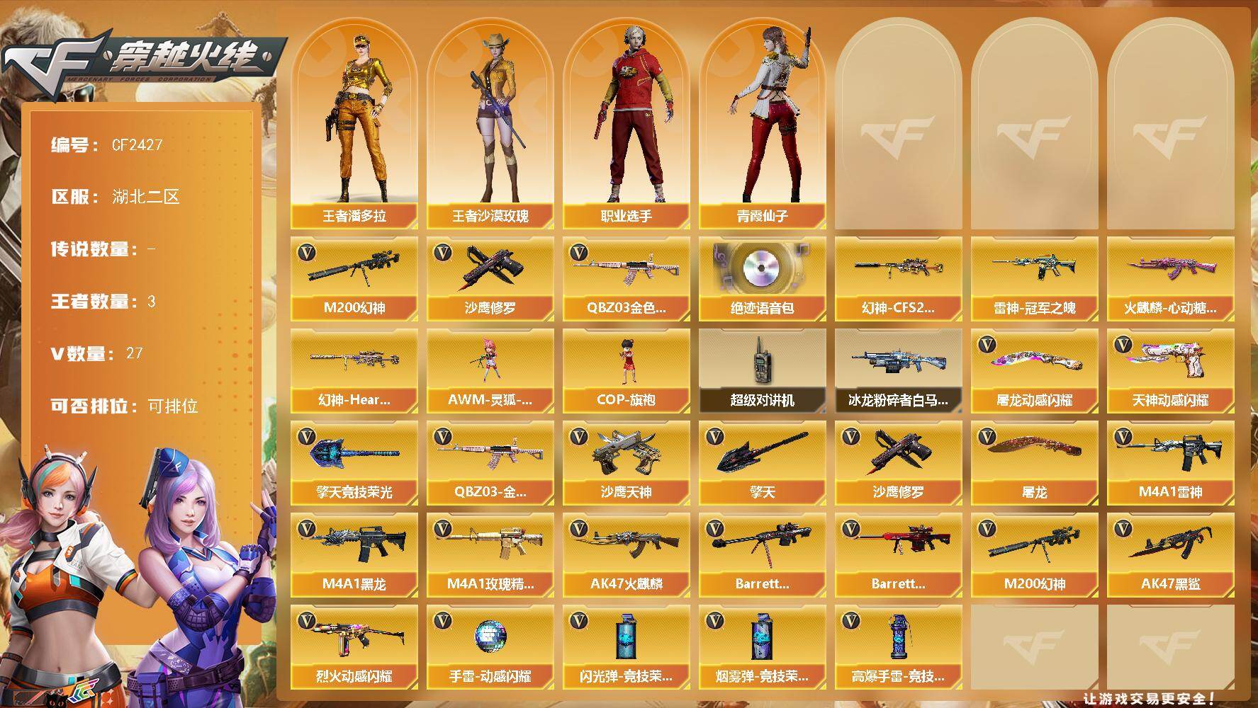 1传说角色 1传说武器 3炫金武器 34V武器 6V角色 12皮肤 可排位 传奇