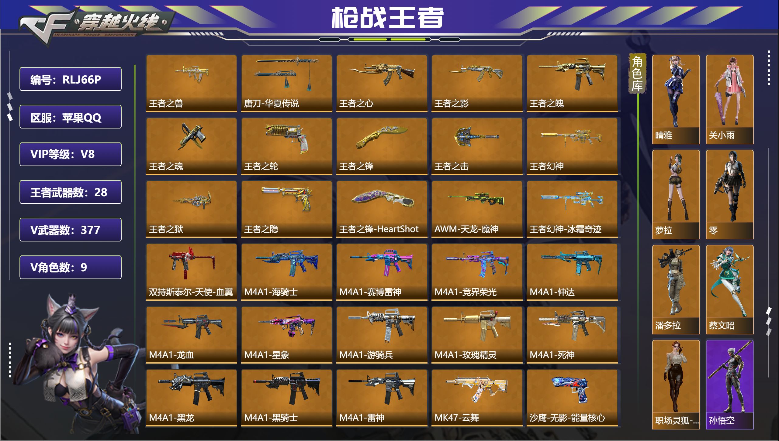 VIP等级:V8,V武器数量:290,V角色数量:17,V总数量:217,王者武器数:22,万化数量:489