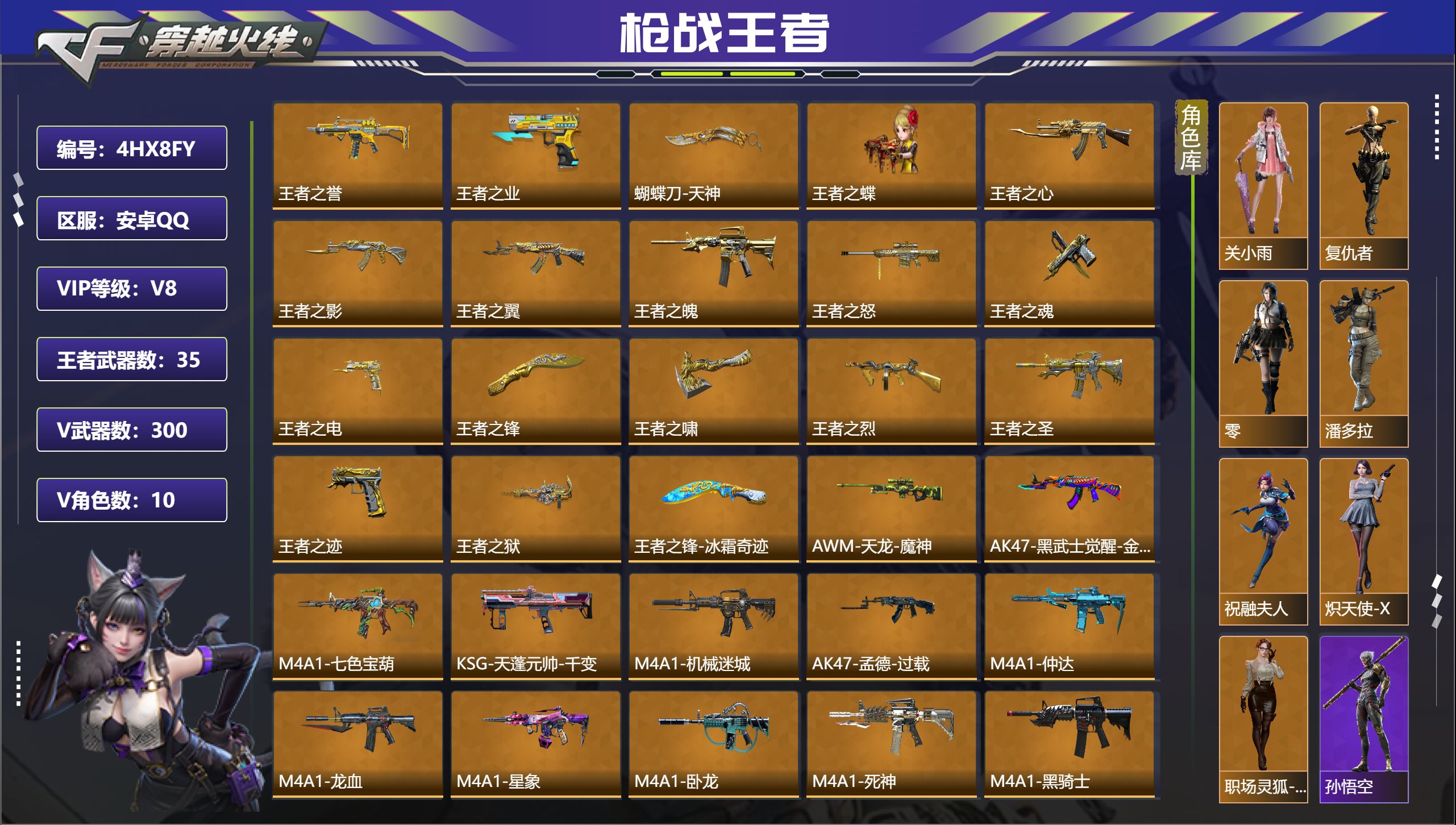 VIP等级:V8,V武器数量:224,V角色数量:11,V总数量:189,王者武器数:26,万化数量:207