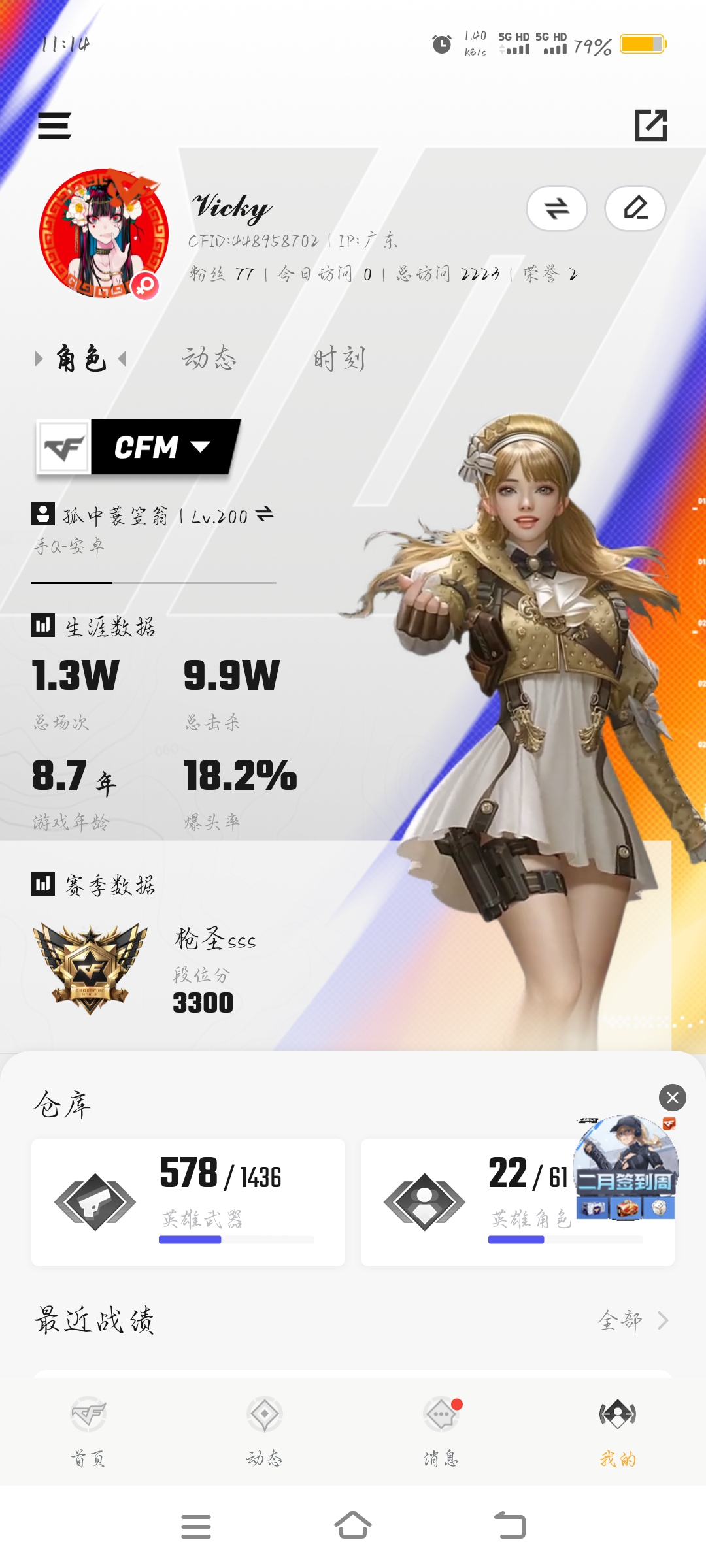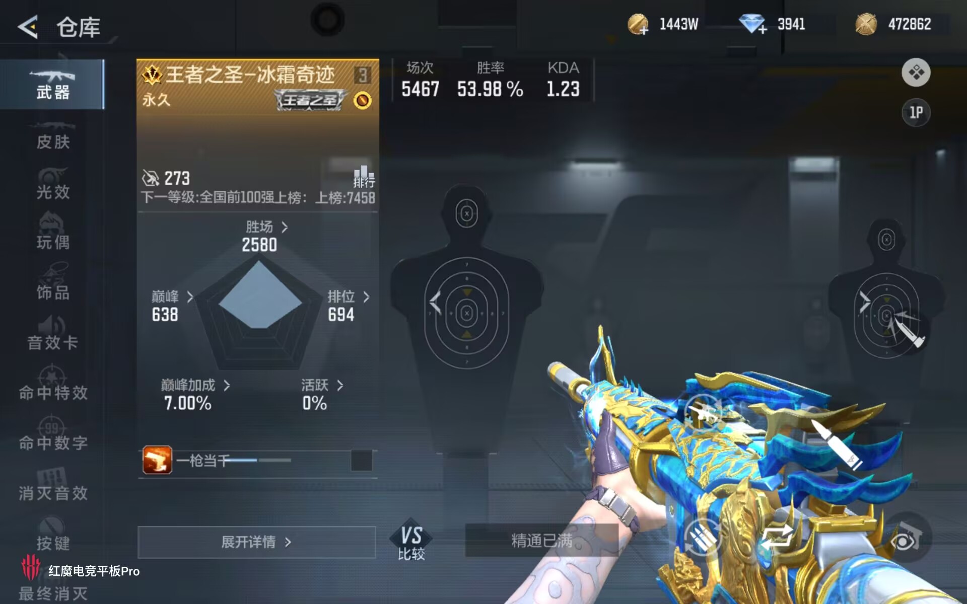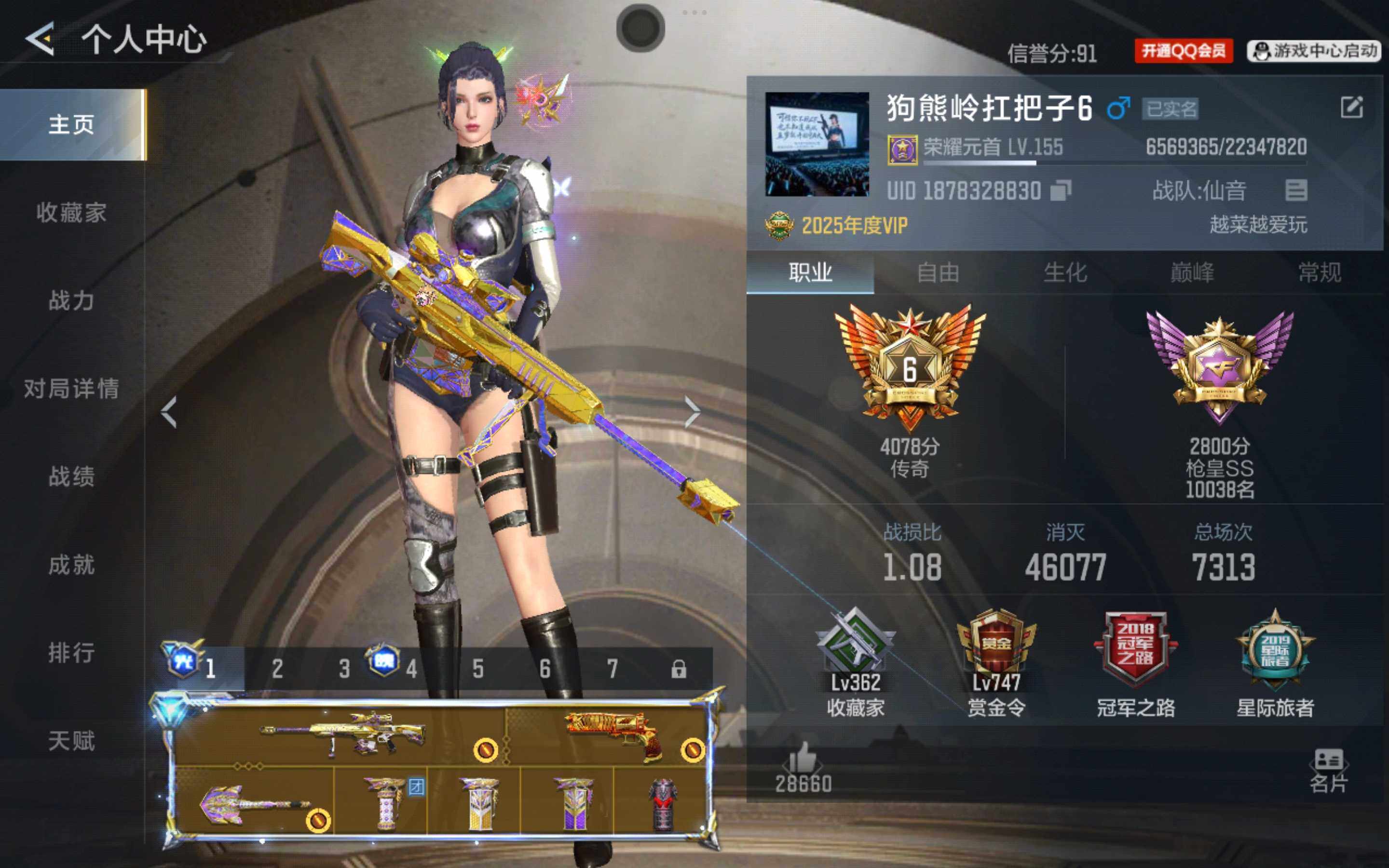 段位:传奇,VIP等级:V8,V武器数量:377,V角色数量:14,V总数量:273,王者武器数:16,万化数量:569,音效皮肤数:10
