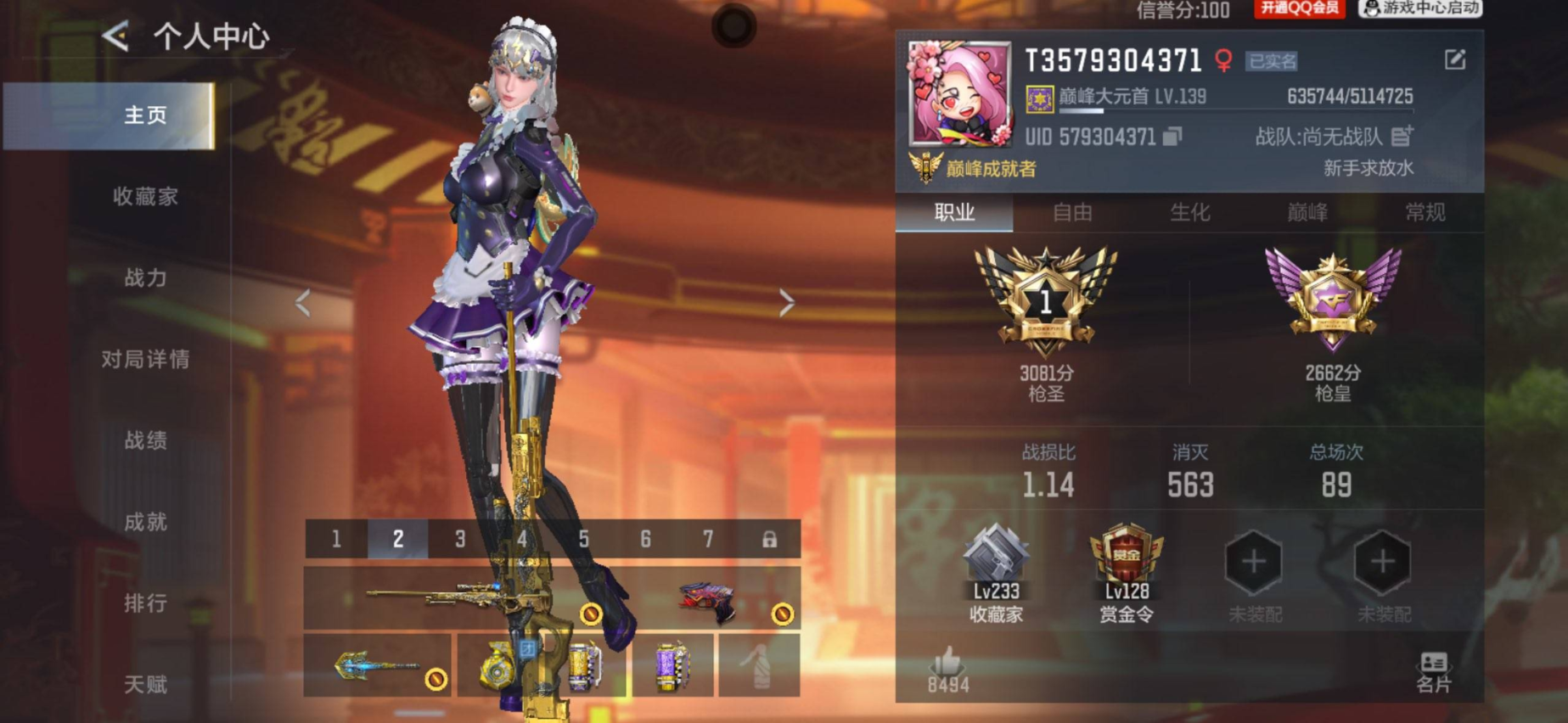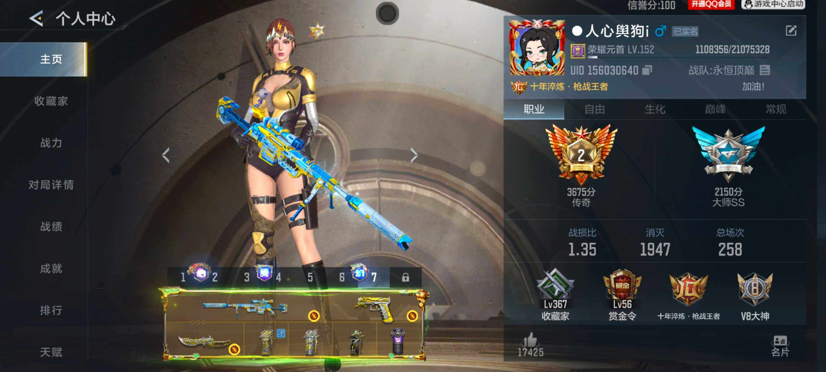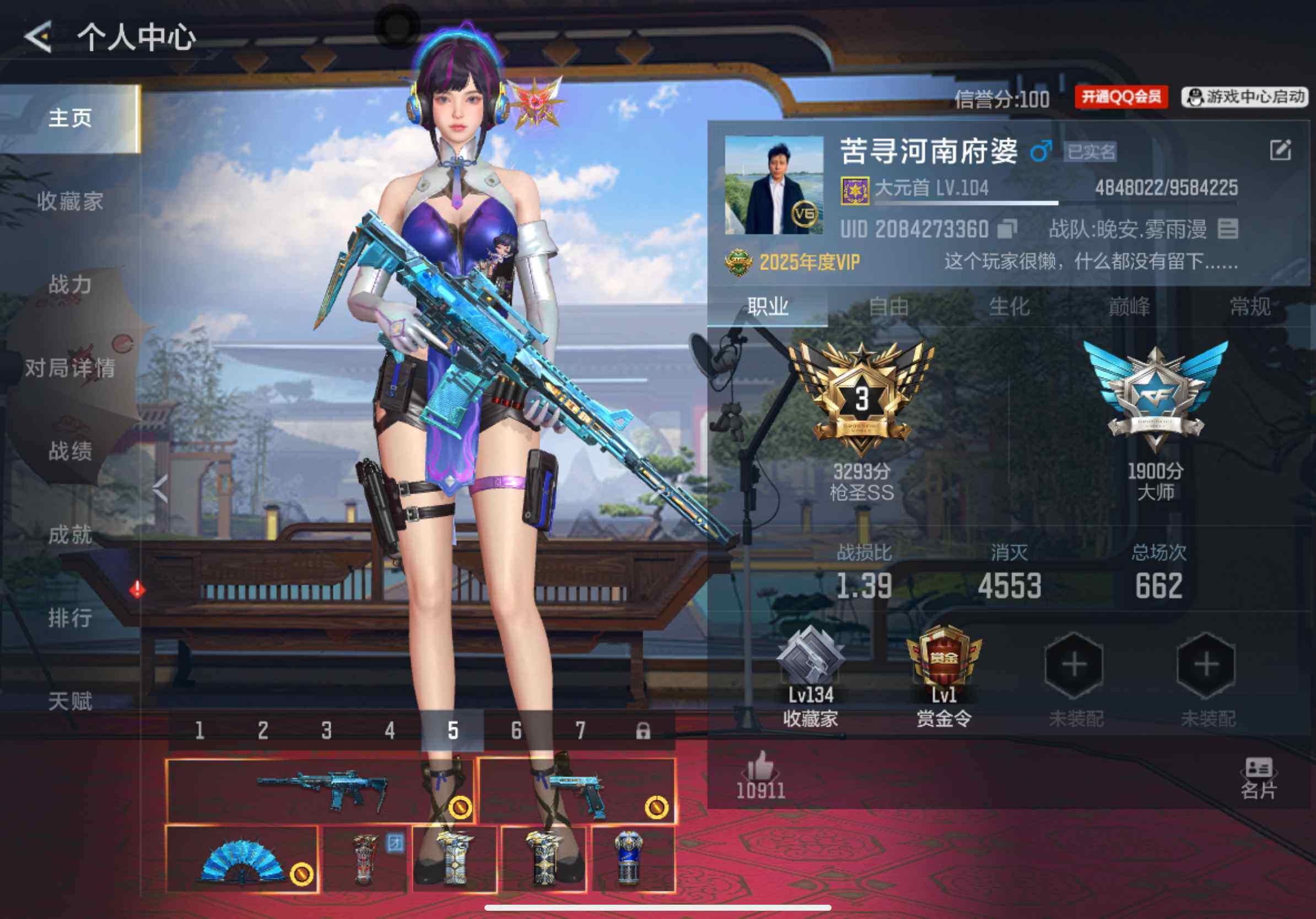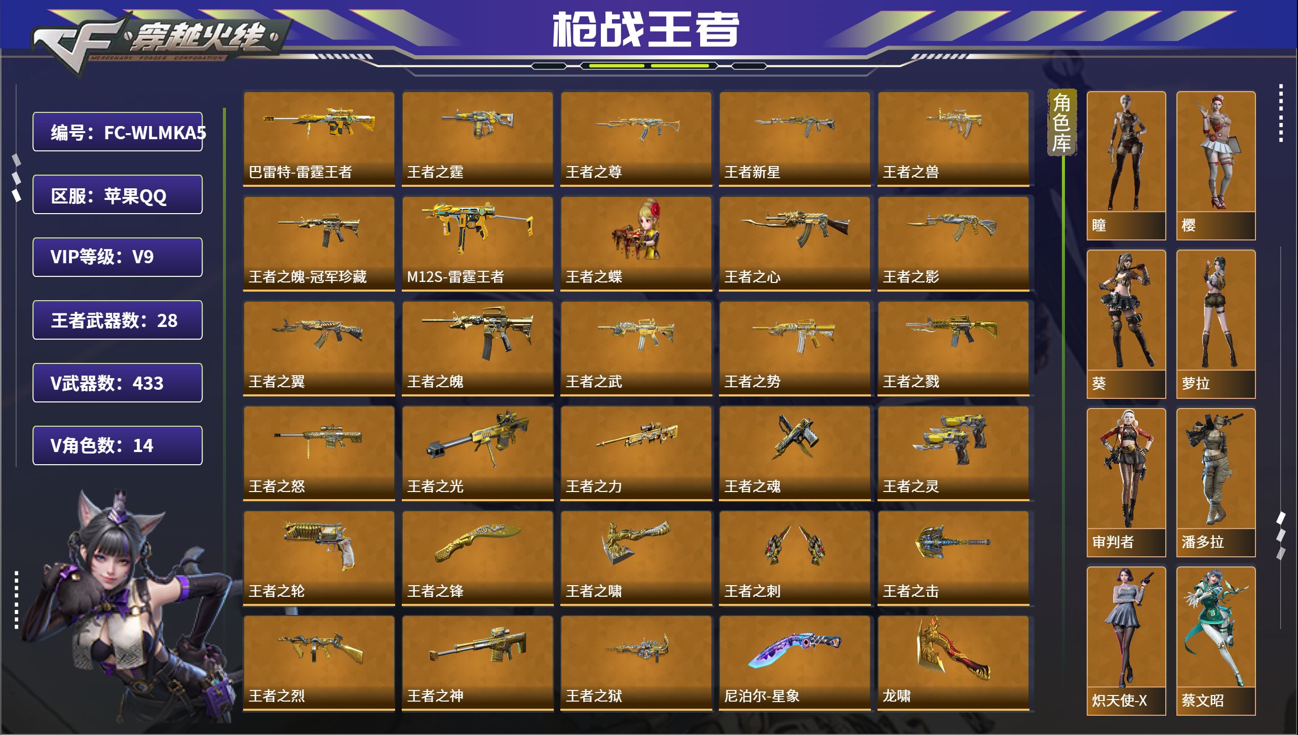 段位:大师SS,VIP等级:V9,V武器数量:433,V角色数量:14,V总数量:322,王者武器数:28,万化数量:427,音效皮肤数:6
