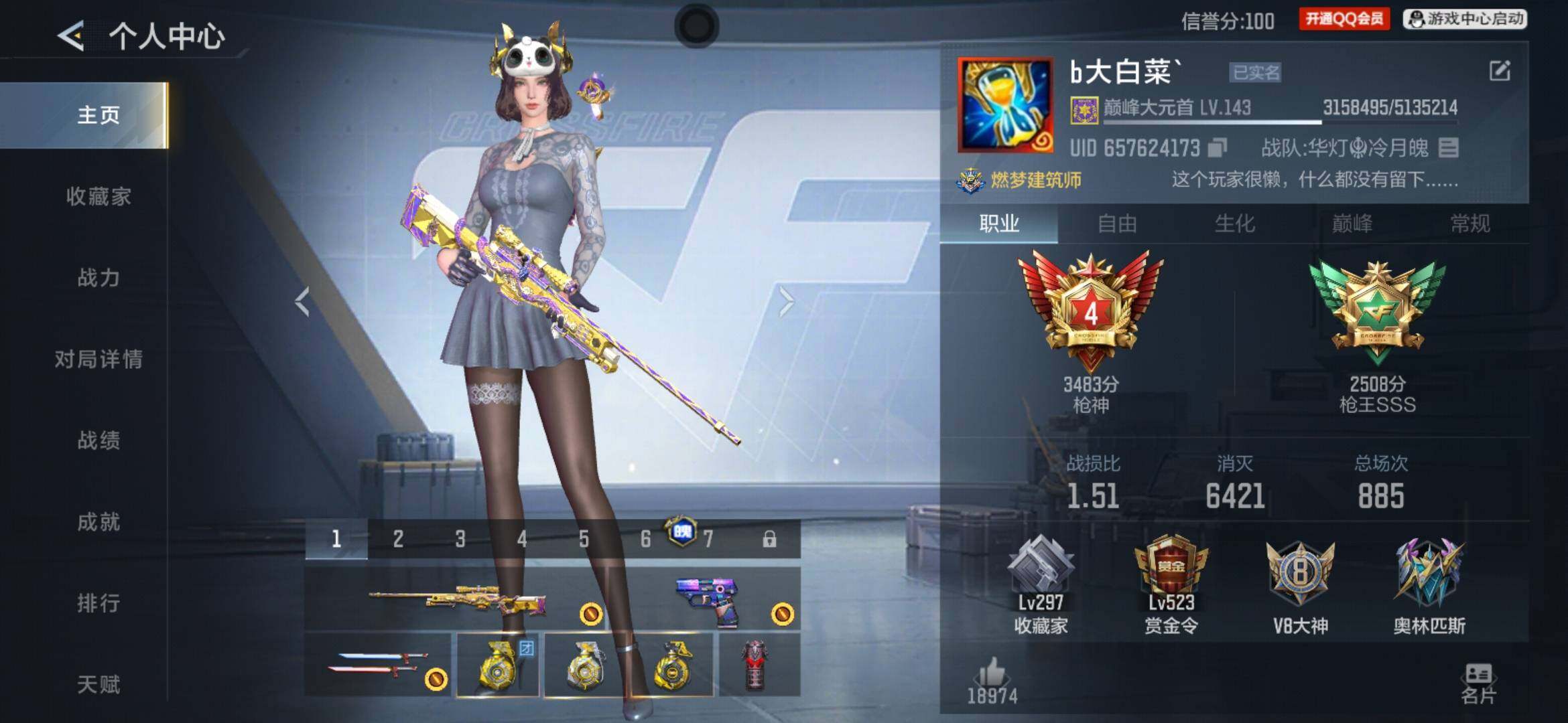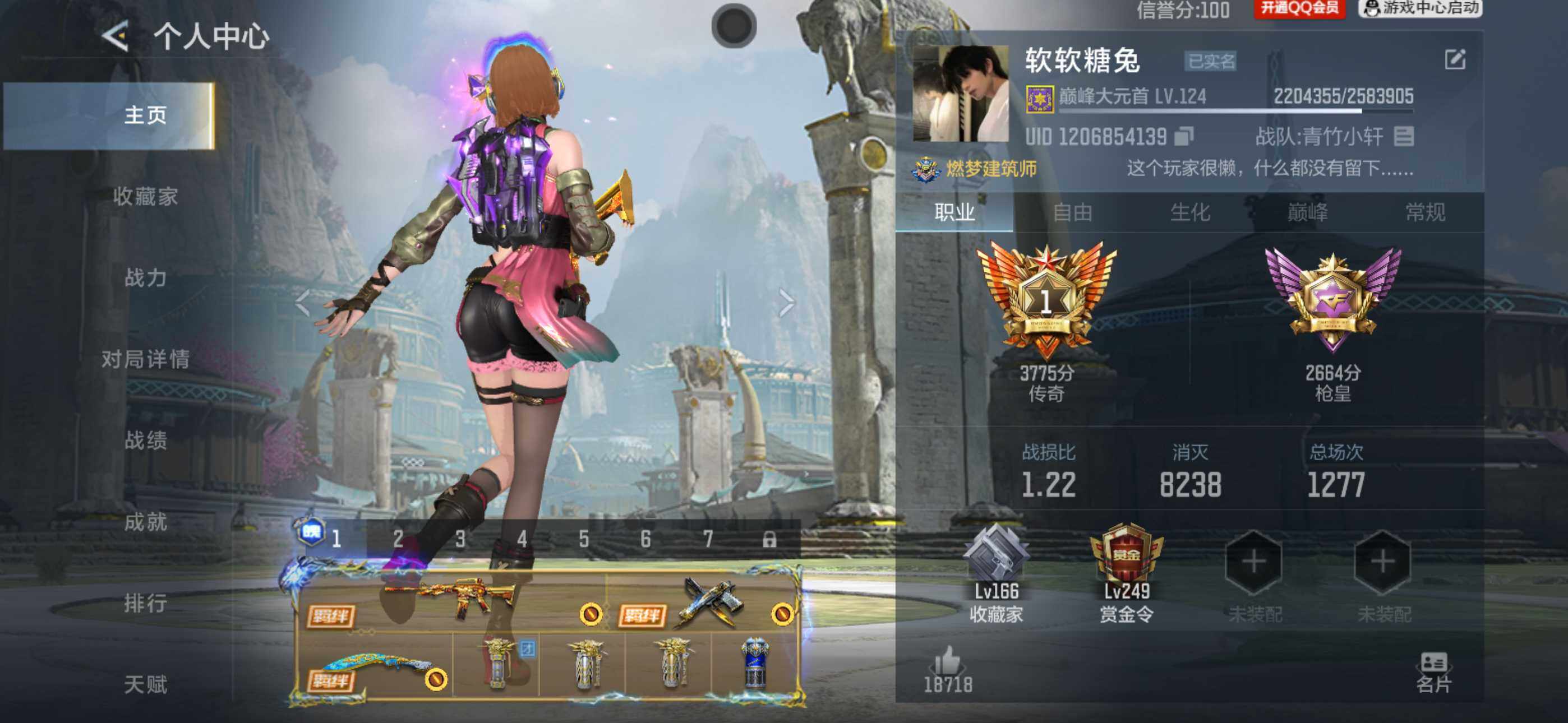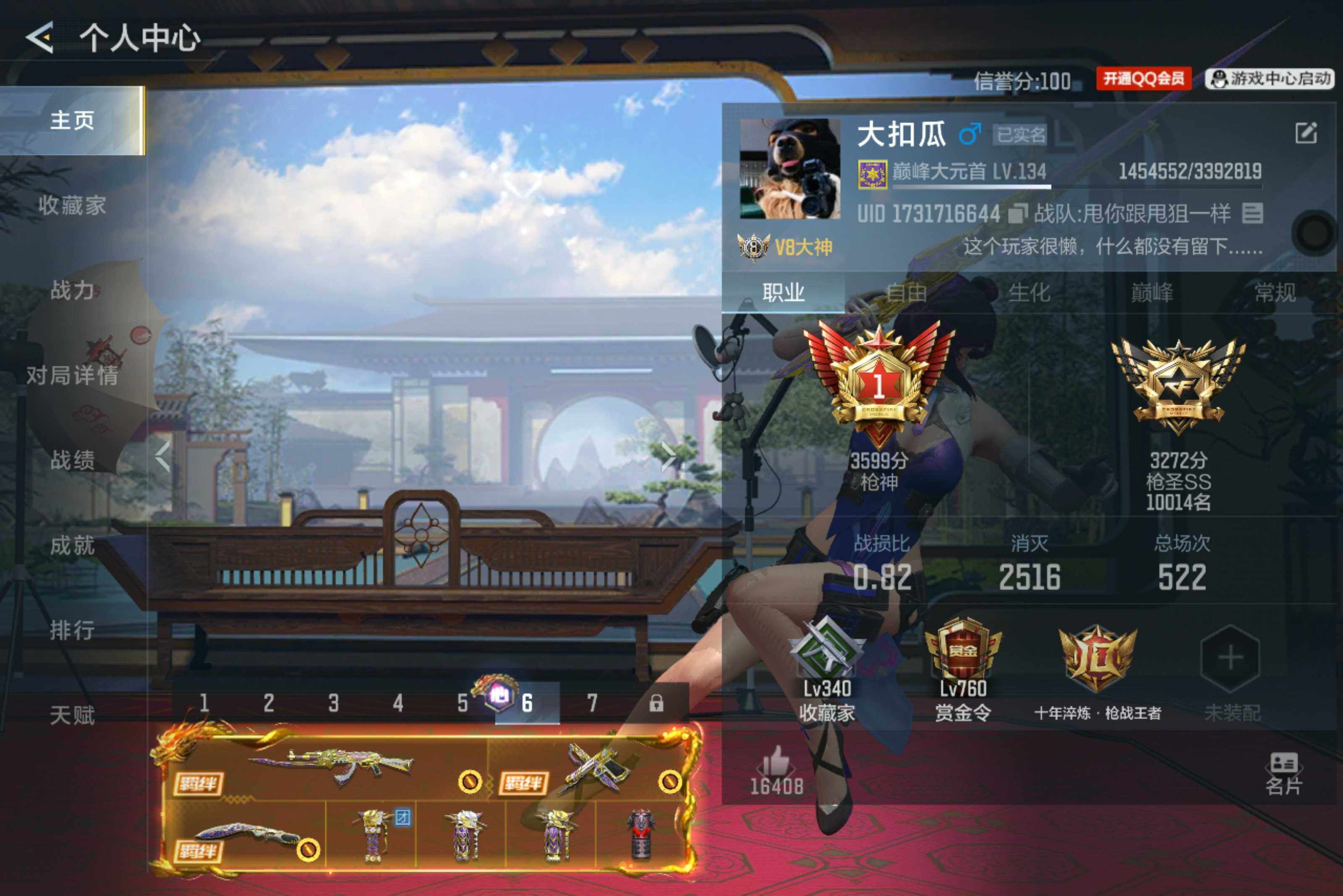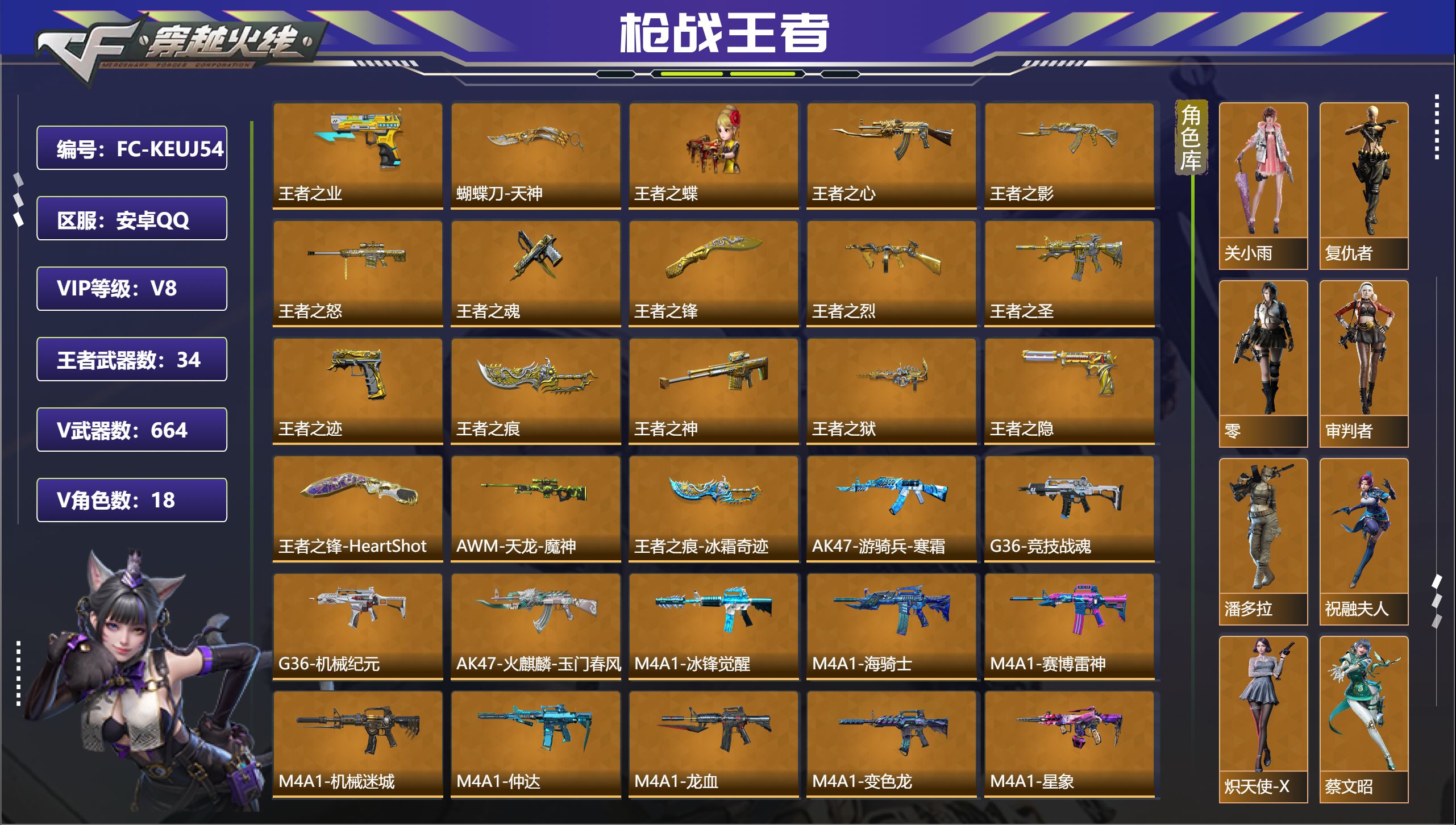 VIP等级:V8,V武器数量:664,V角色数量:18,V总数量:349,王者武器数:34,万化数量:784