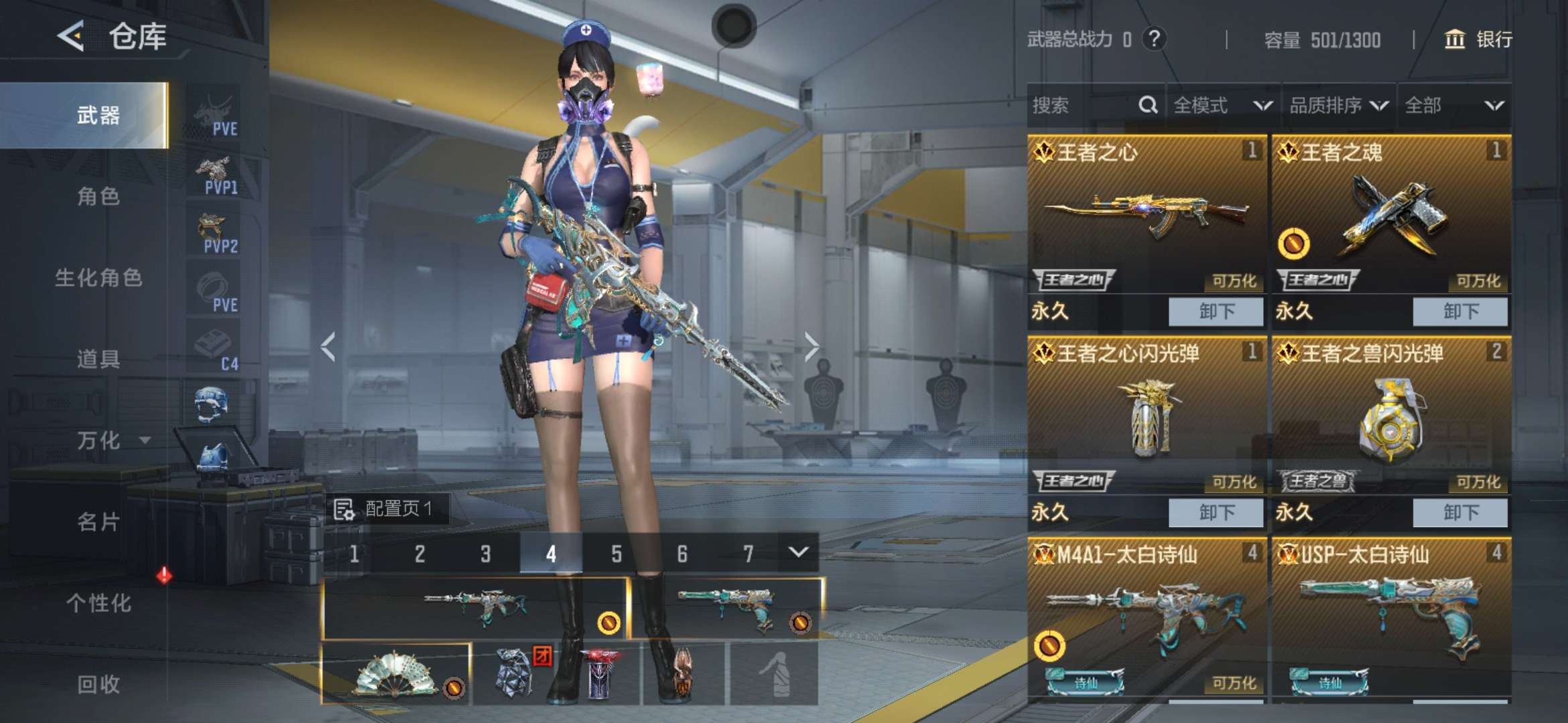 4个王者武器,4把屠龙,太白诗仙套,王心,王魂,雷神,毁灭,枪很多!