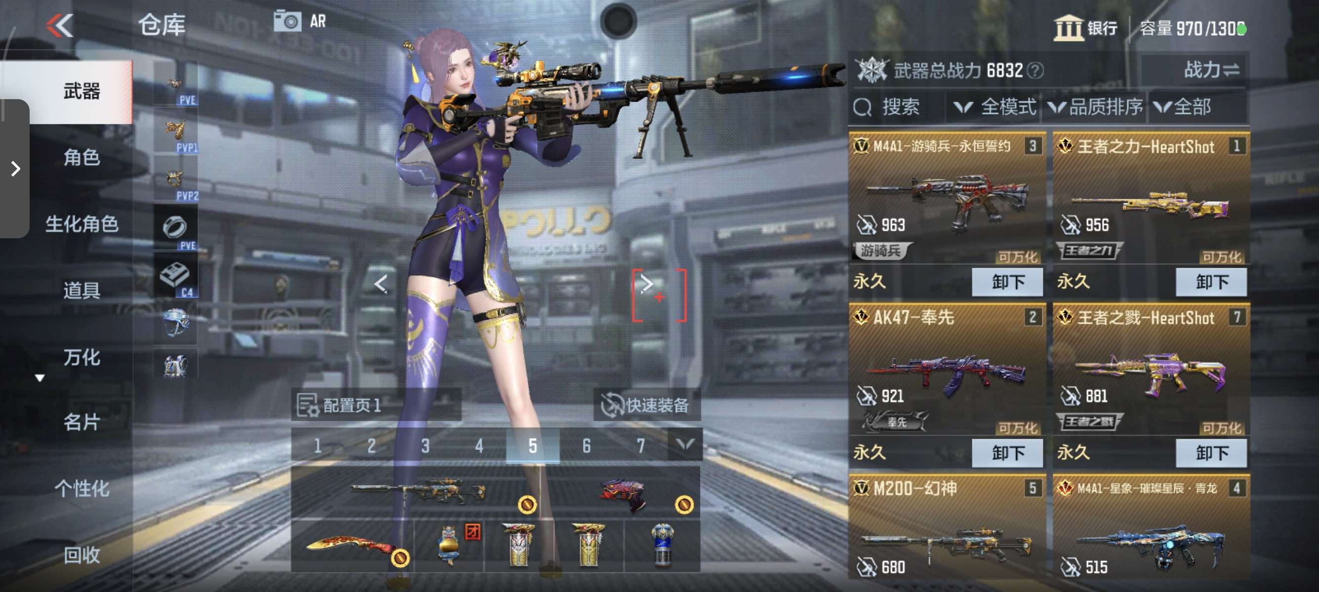V8-AK47-奉先 MK23-幻神 USP-仁德 M200-幻神 AWM-妙才 TAC-慈 VEPR12-本初 KSG-孟获 激昂霸王枪 墨刃-幻神 小刀,大刀勿扰…………