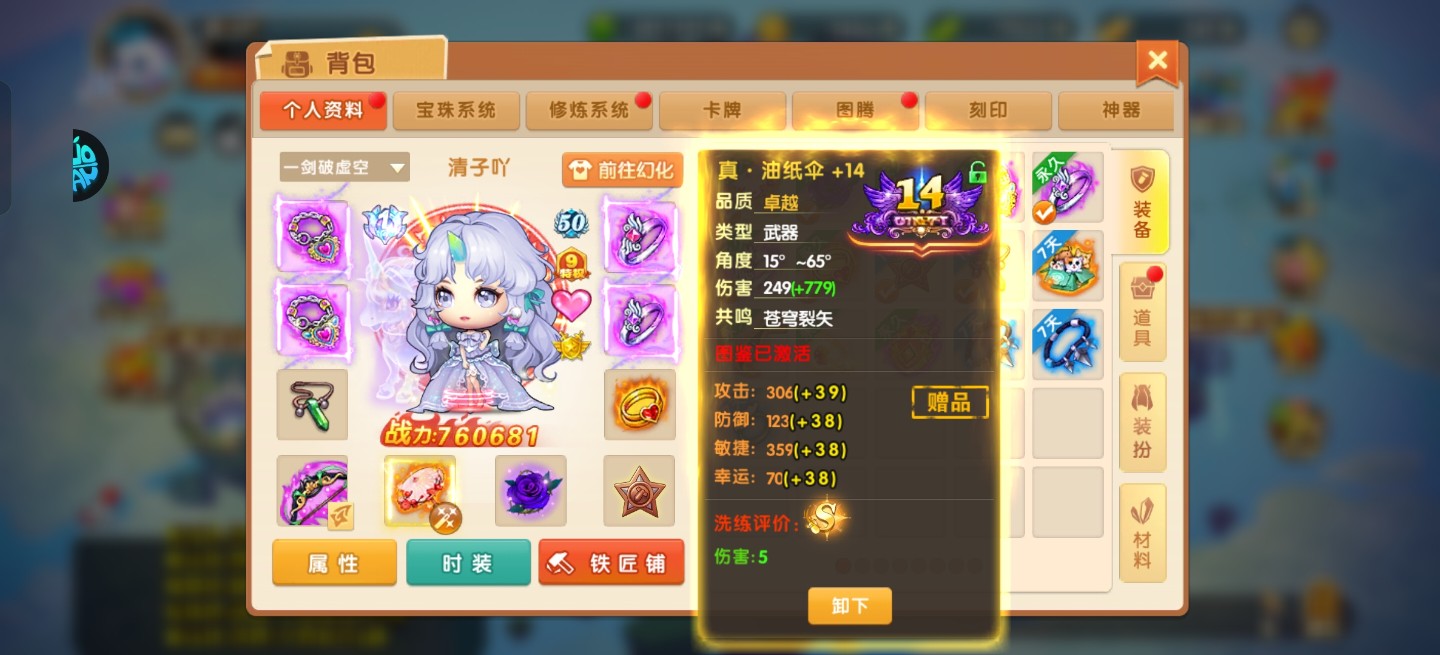 大宝剑+13衣服+12帽子+12副手+9 有三组石头让你体会强化快乐
