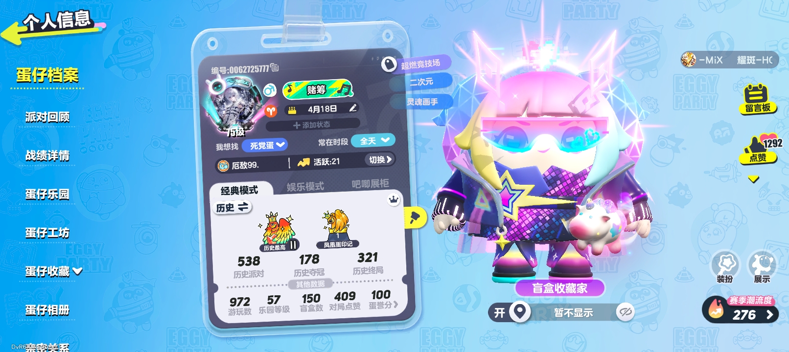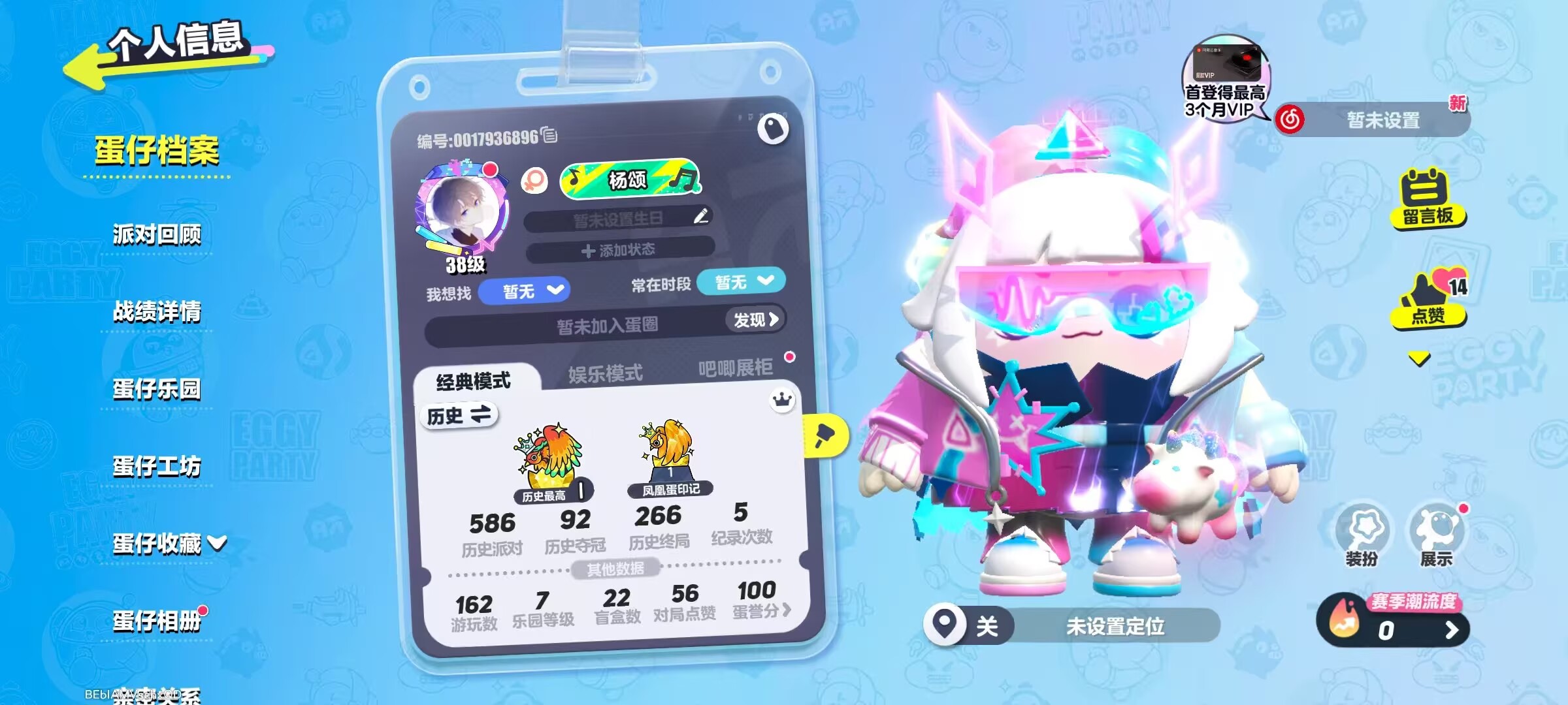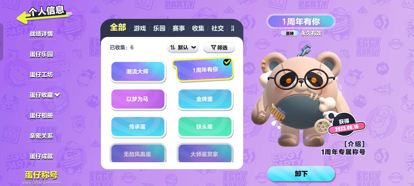 - S6赛季开服元老号,从派对初潮一路陪伴至今,拥有“1周年有你”等绝版至臻称号,是老玩家身份的象征