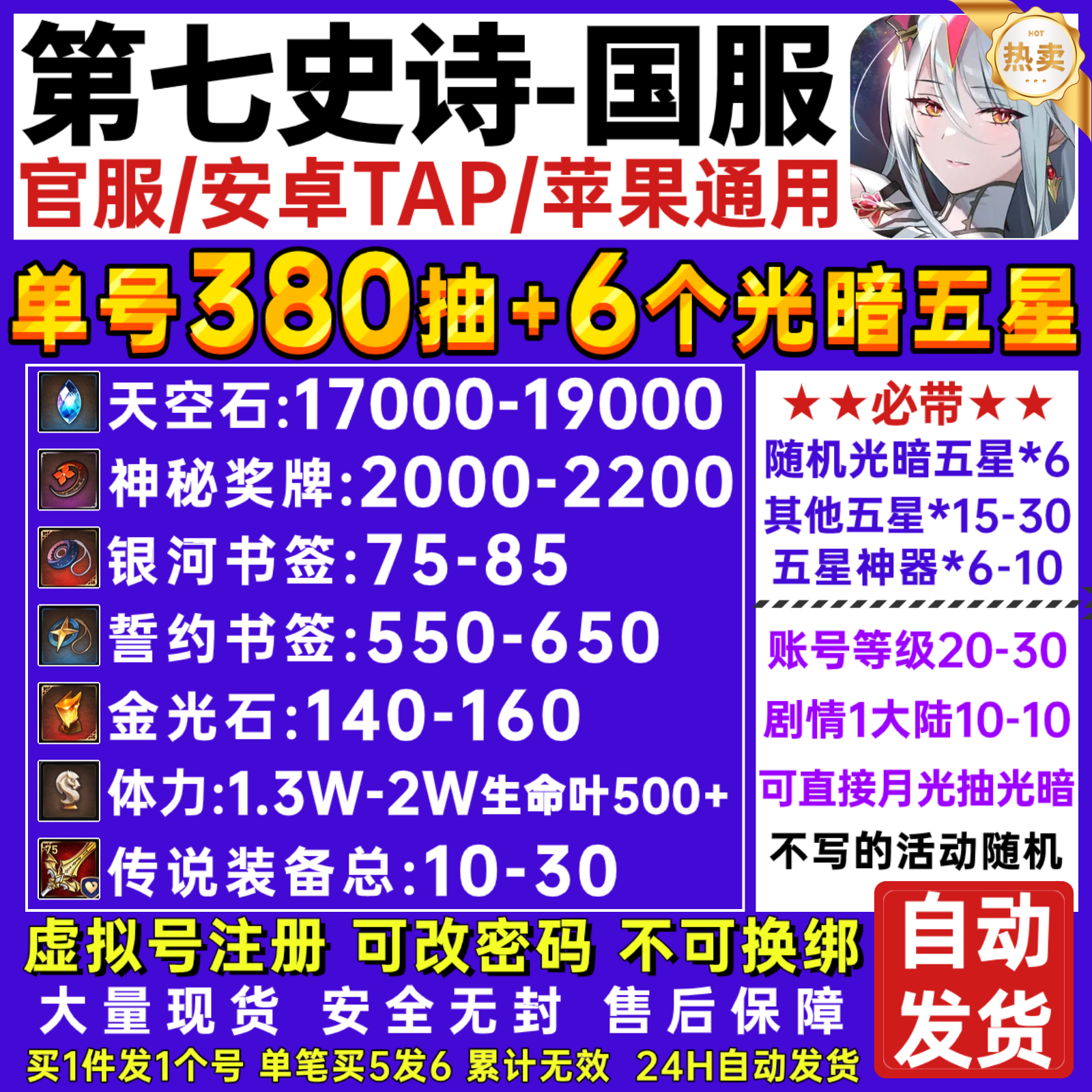 官服🔥4万星空石+1100誓约+3万体力🔥随机小恶魔路雅/苍穹伊莉娜芙+2光暗🔥