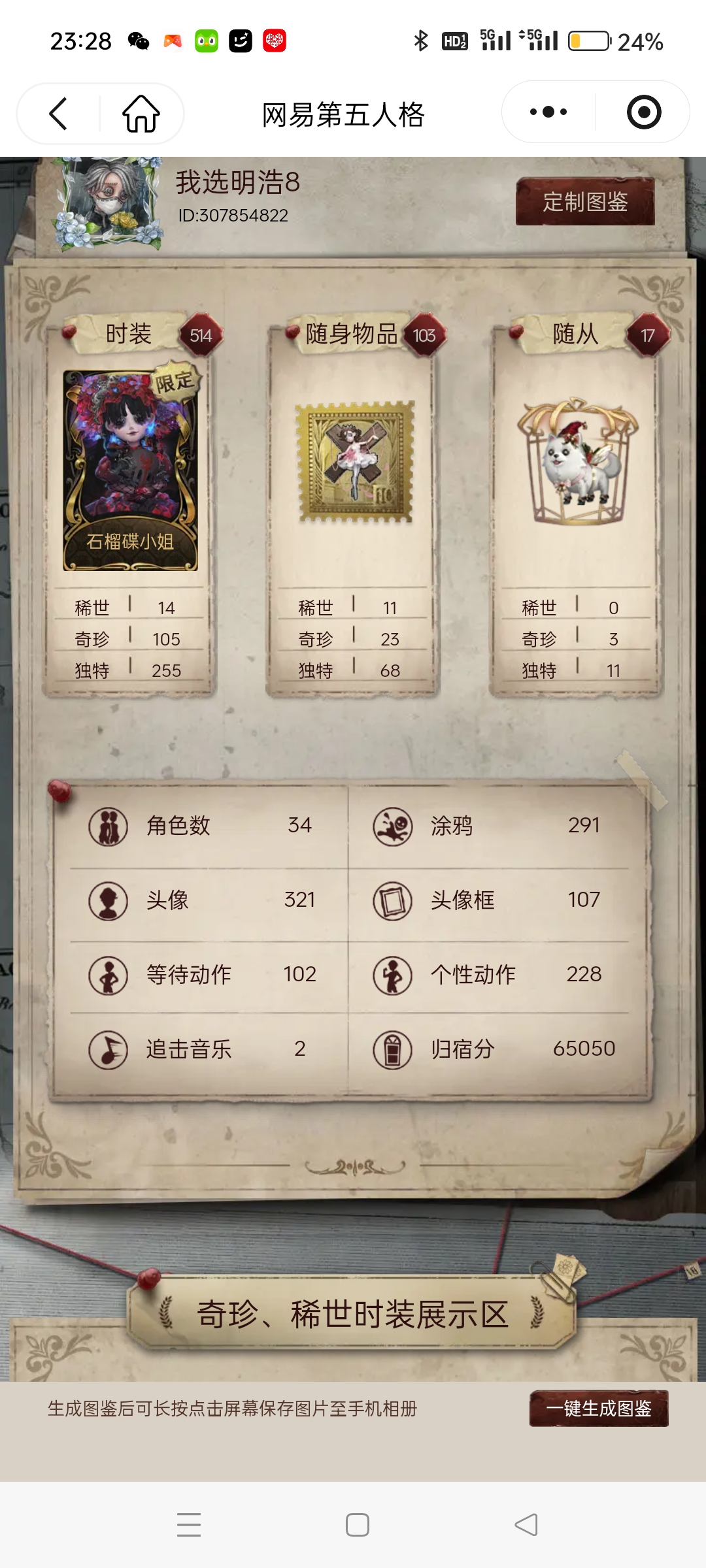 小米服第5人格可以转官服。400个皮肤6个金皮限定采风的仙灵64个紫皮10个金挂需要的话
