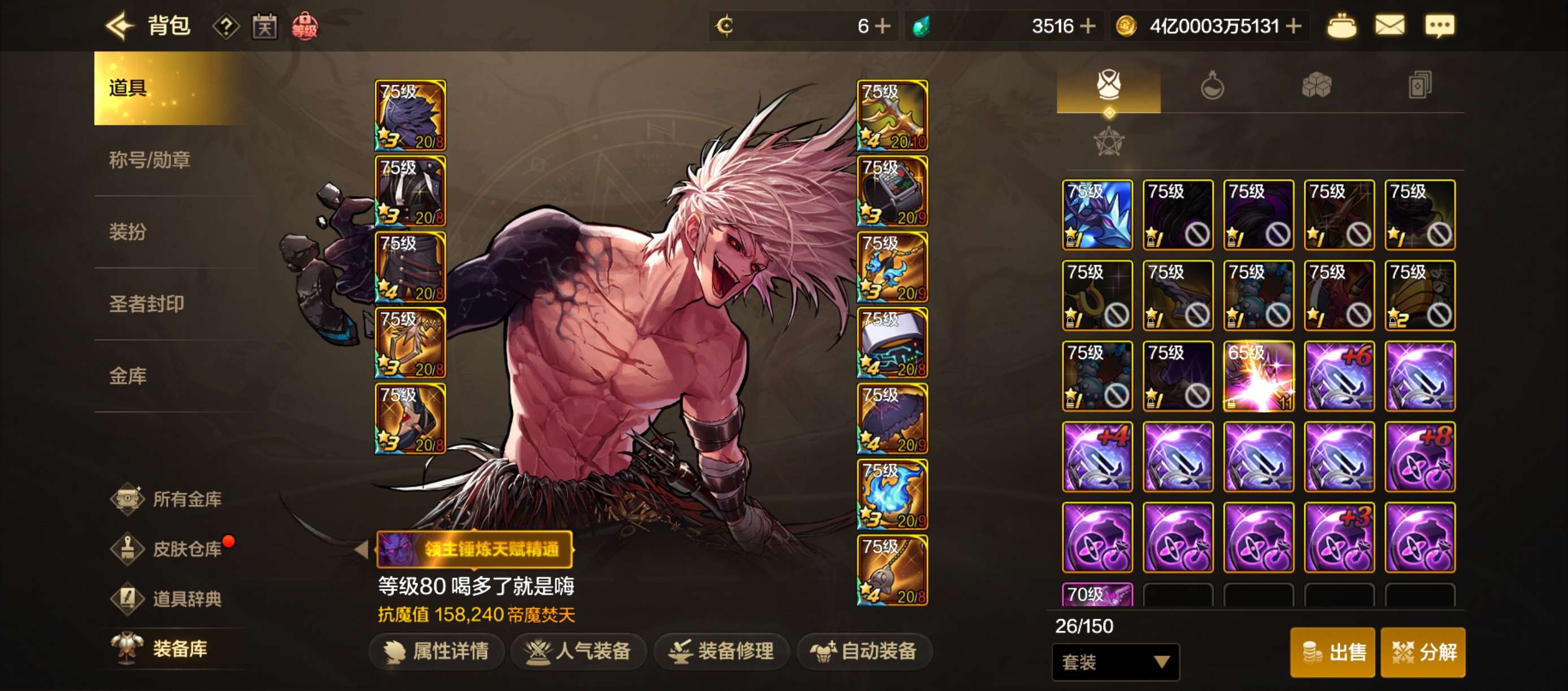 四姨,套装基本都齐了,抗魔值144560,武器增幅10