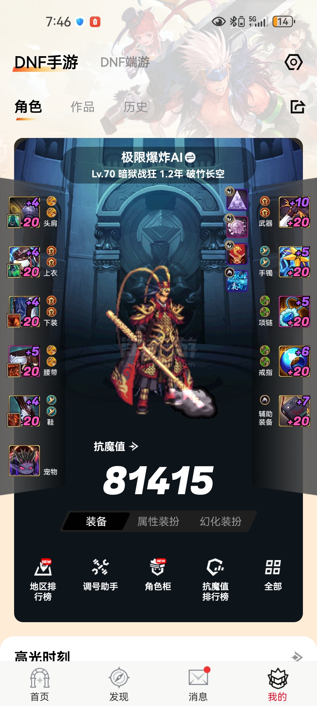 地下城与勇士起源手游,武器增幅10,其余增幅6。全至尊拉满,属强8+8