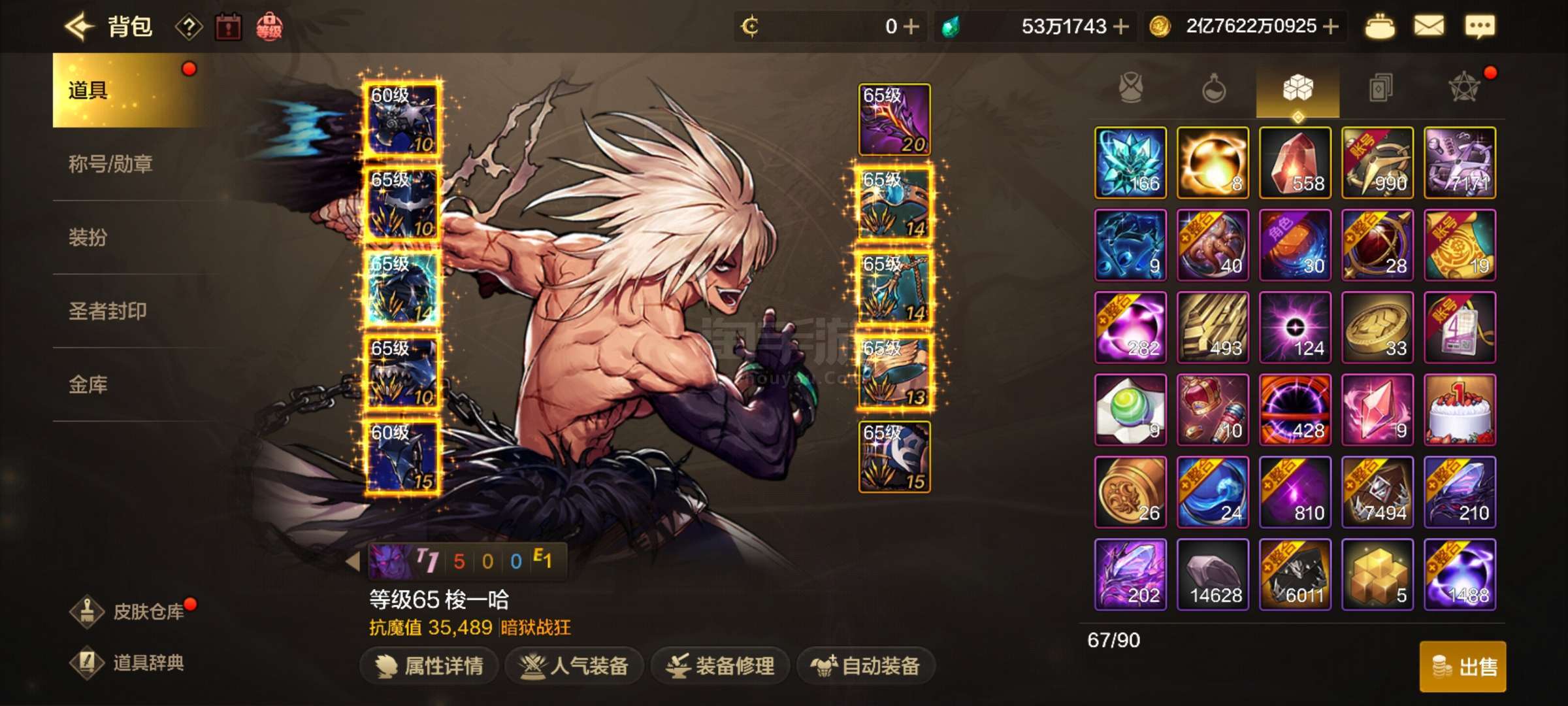 53万泰拉,700多代币,2把20武器,2把18-19武器,主角色35500抗磨,3个29000多