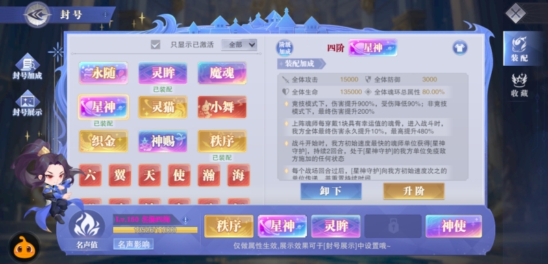 1500亿战力。79级魂圣。大供奉。红5带皮王林。称号:灵眸。永随。灵猫。织金。10级神位霍雨浩。