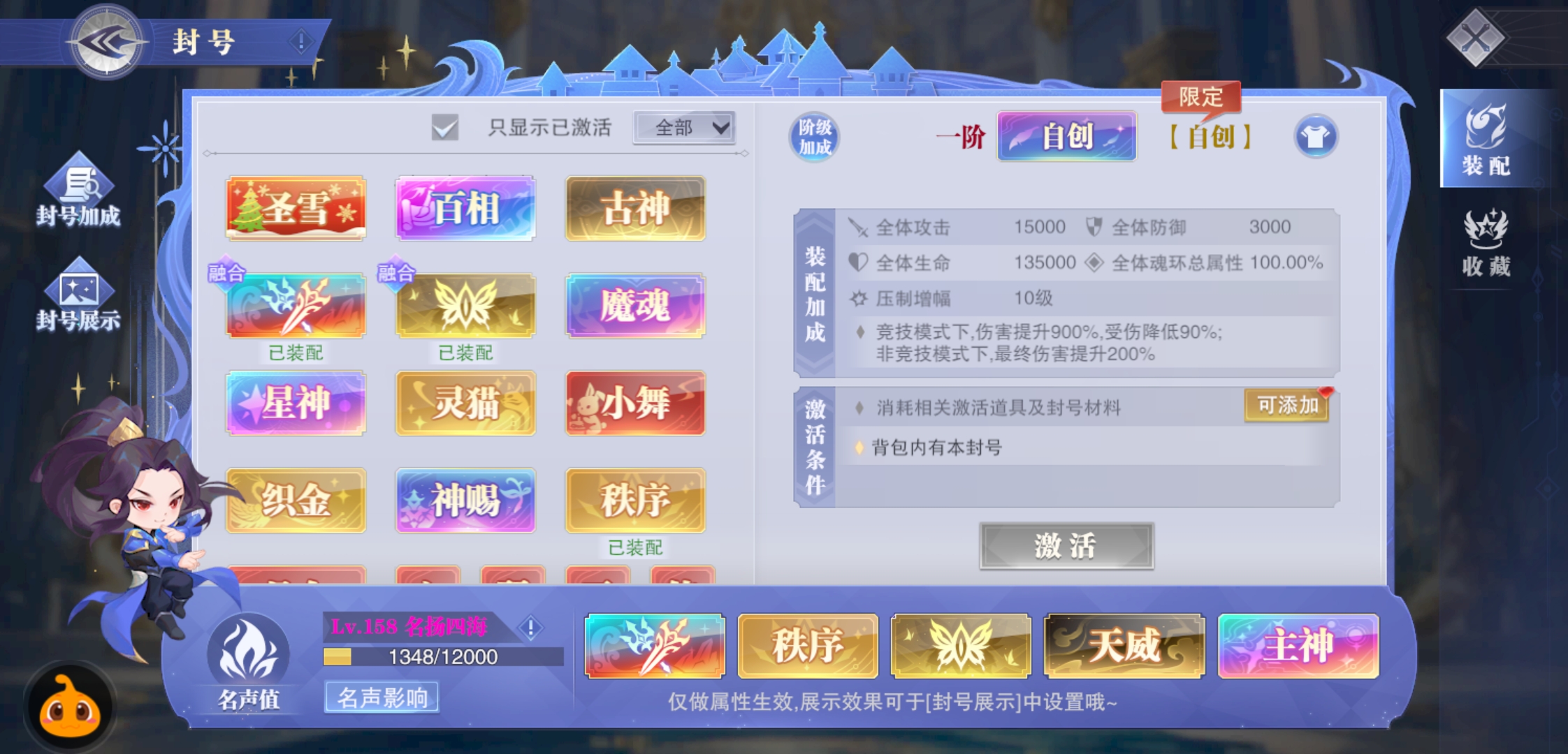 顶级天威霸服新区千机阁主,刚77级纯实战,基本全满,神环全+以上,魂火+3,封号财神,自创现在就可开