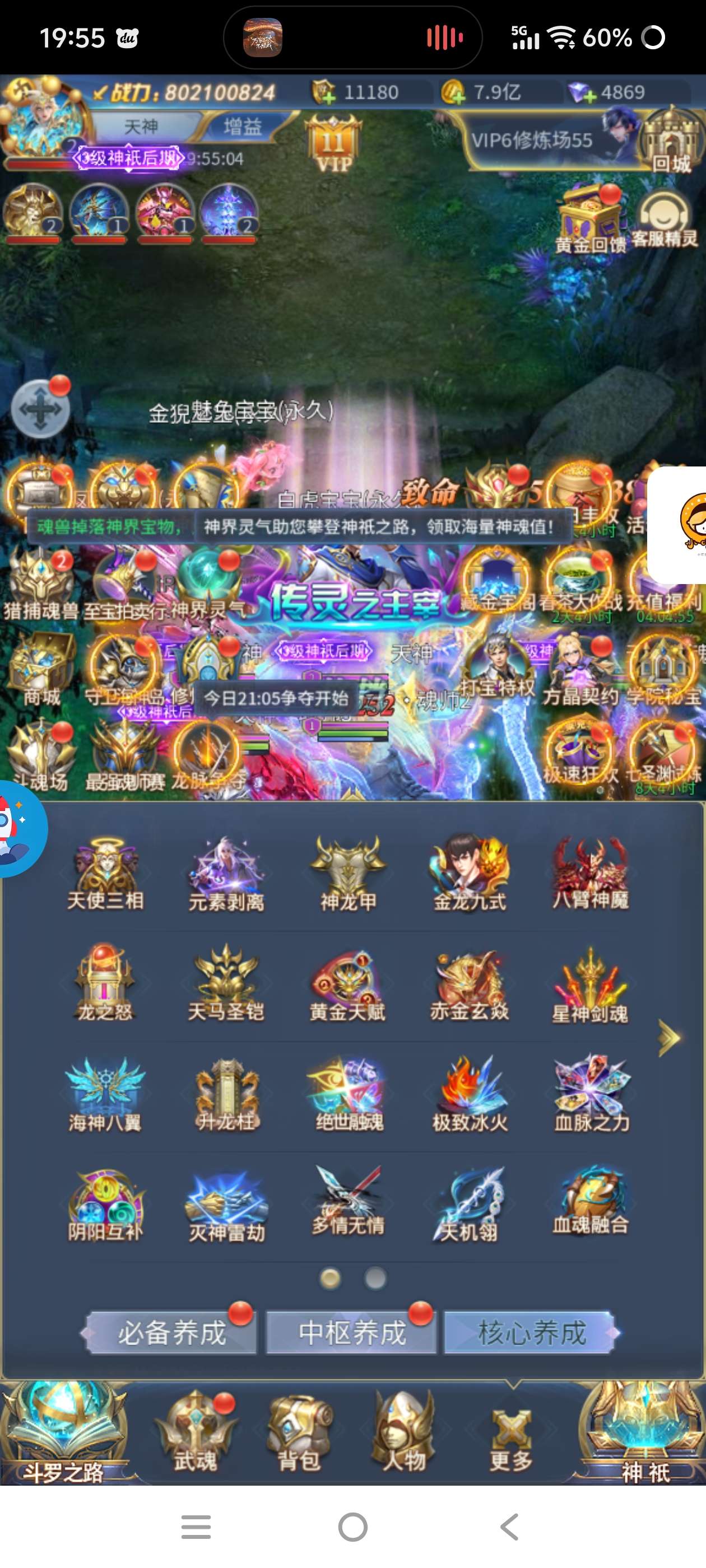 天使极速48半新区压战号 满魂骨一套半彩 龙神知名号 区前3 买了真髓一套觉醒 背包还有15个觉醒