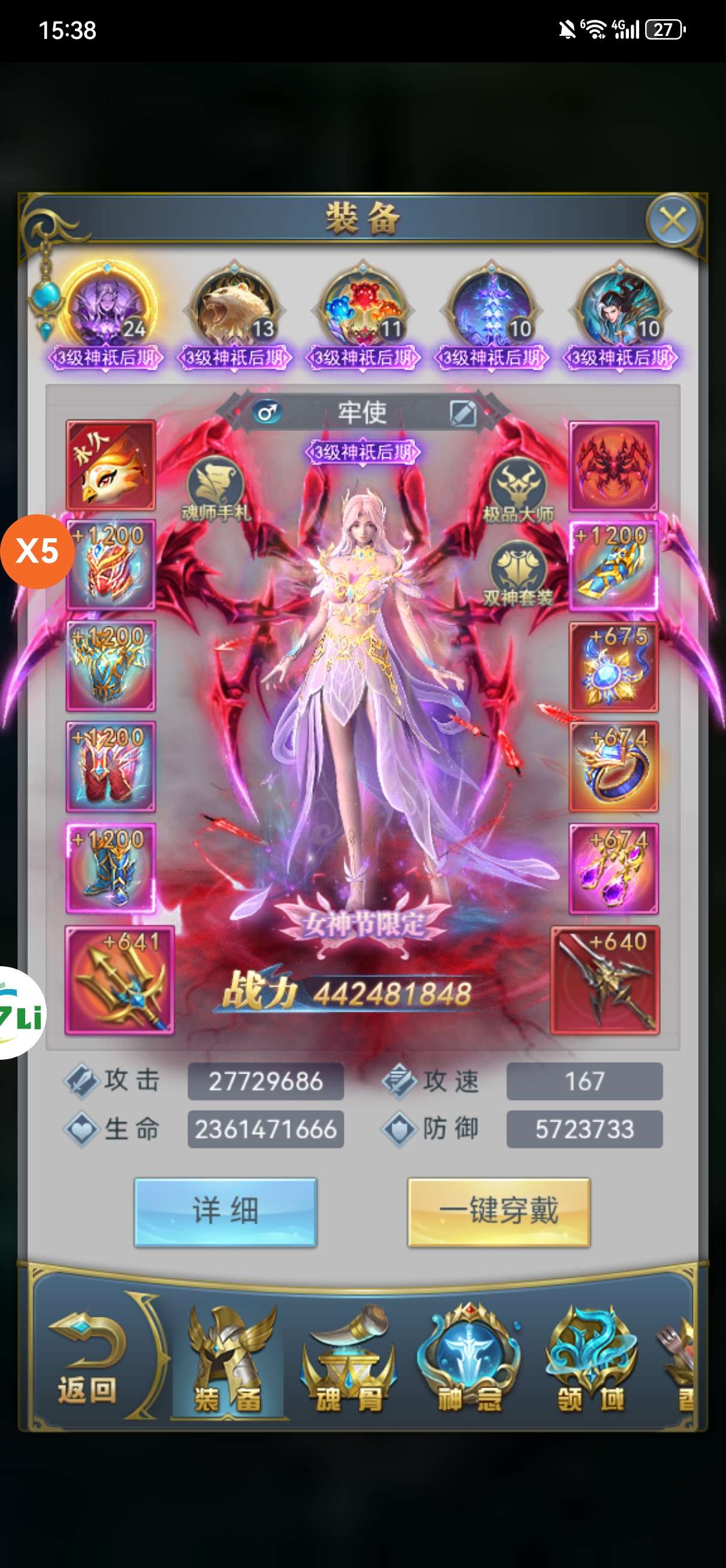 天使极速48半新区压战号 满魂骨一套半彩 龙神知名号 区前3 买了真髓一套觉醒 背包还有15个觉醒