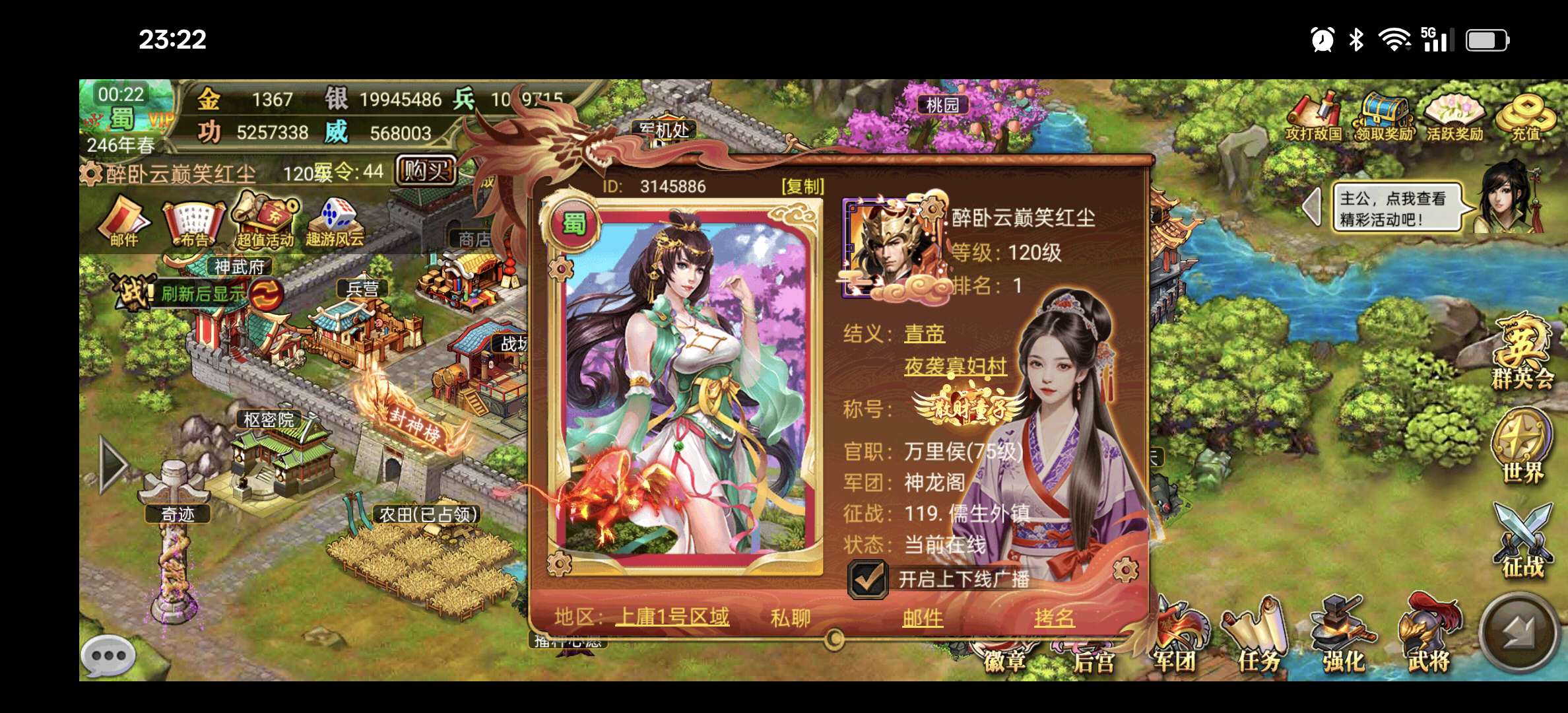 还价勿扰,金27万,酒非常多,足够进阶陆逊或者许褚或者孙策,自带天公张角外加神将宝箱,39势力