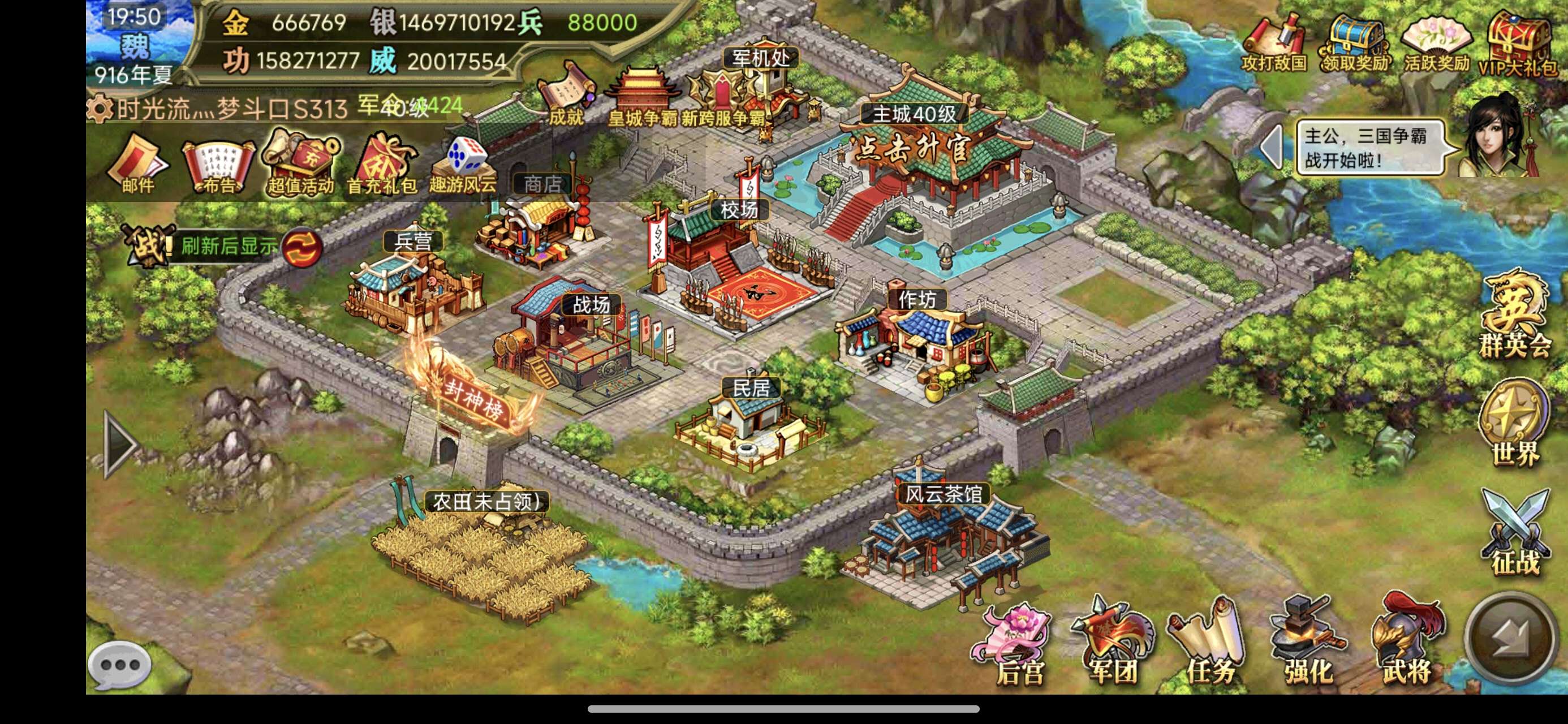 还价勿扰,40级金66.6万,纪念将多,可以邮件客服改名,自带15万神将天公张角,小势力