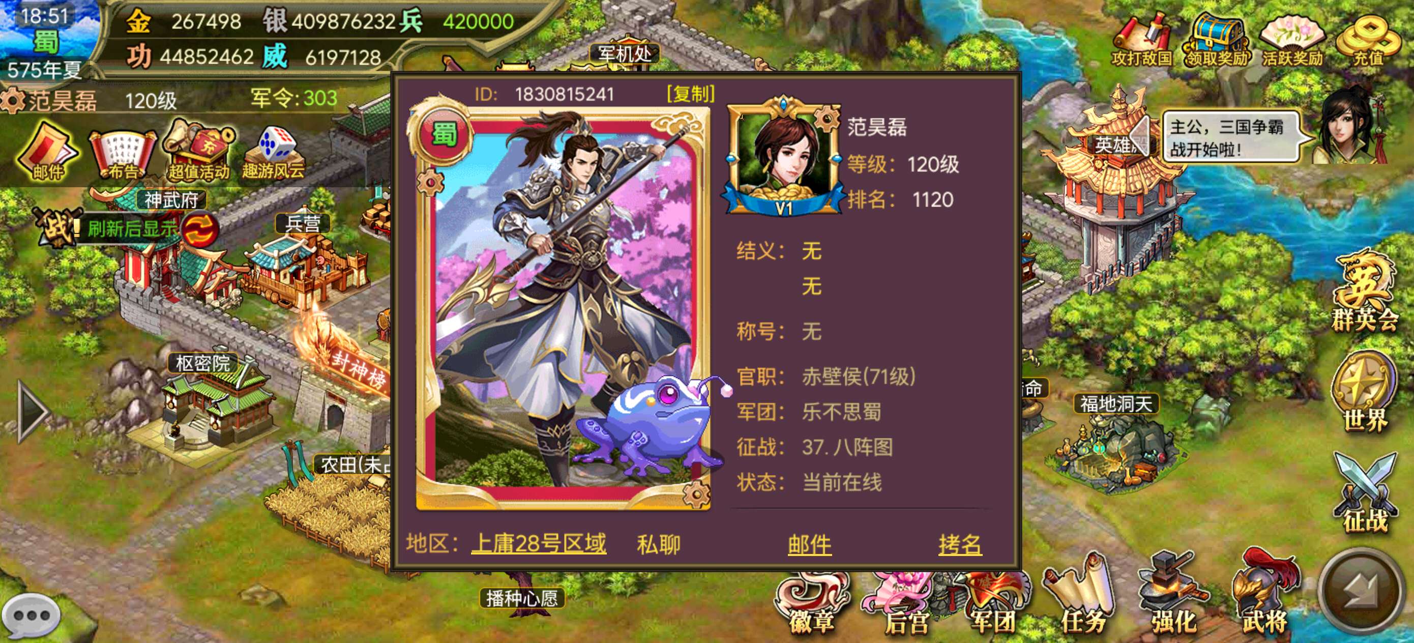 还价勿扰,金67万,自带15万神将天公张角,外加神将宝箱,夷陵势力