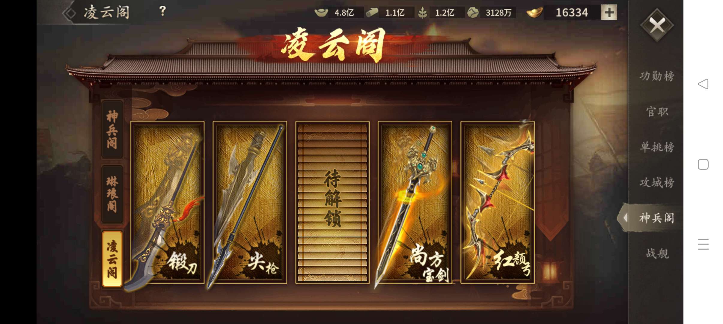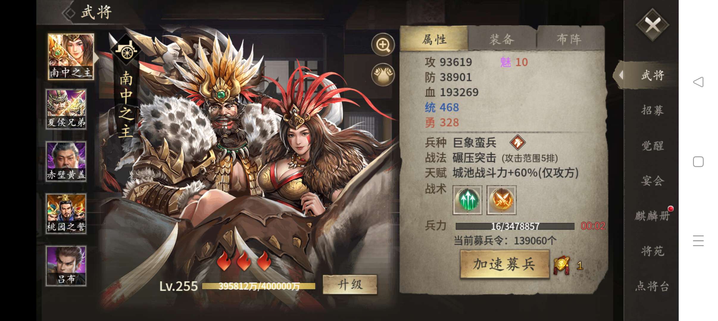 54万4层关羽,大帝满配,有武冈车、火船,兔子,阵法360+305,黄盖已二次觉醒,大刀勿扰。
