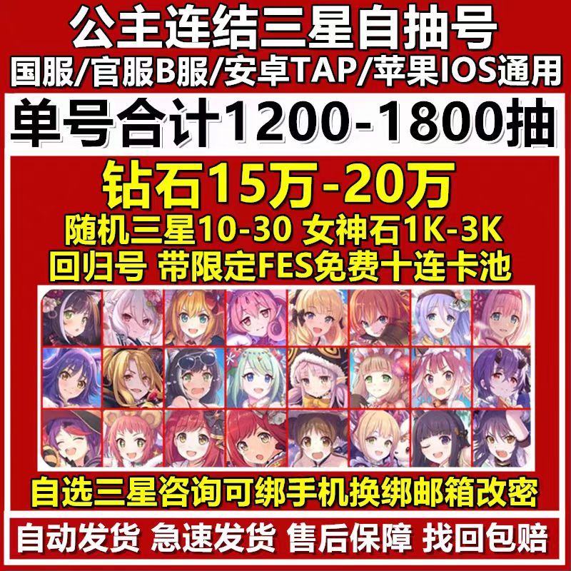 15万砖 随机附带20-10三星/限定角色/fes池/回归号/女神石900-1500/扫荡卷700-900/扭蛋卷/体力/铂金卷/大量玛瑙