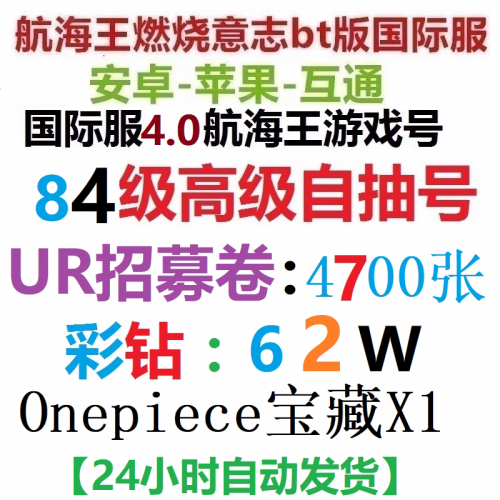 航海王:燃烧意志【安卓其他】【1区】🍎86级游戏账号🍖65W彩钻+🍎4900张UR招募+🍖Onepiece宝藏X1
