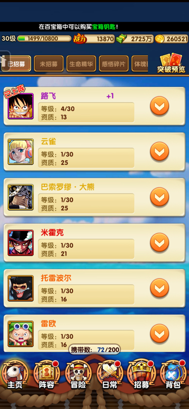 航海王强者之路【安卓官方】v2金币精华开局号.72/单人无替补/三无账号20100精华25.6w金币 !,1800多瓶体力18