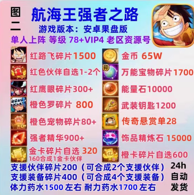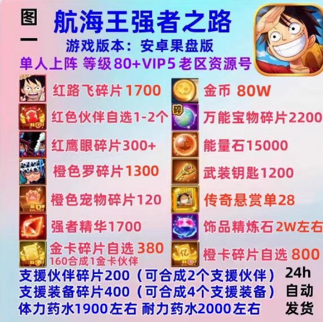 航海王强者之路【安卓果盘】高抽❤️80等级 80万-95万金币❤️1-2个红卡自选❤️4-5个随机宝物❤️vip5
