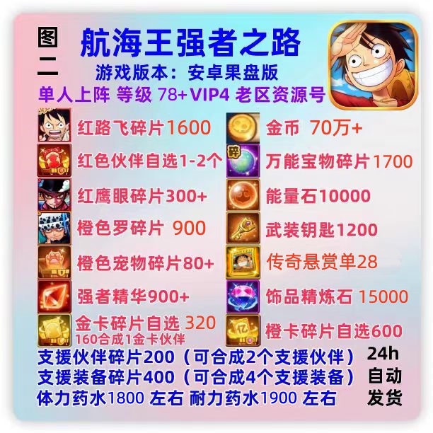 57W金币+红卡自选1-2个+VIP4+等级76左右,超多资源看图