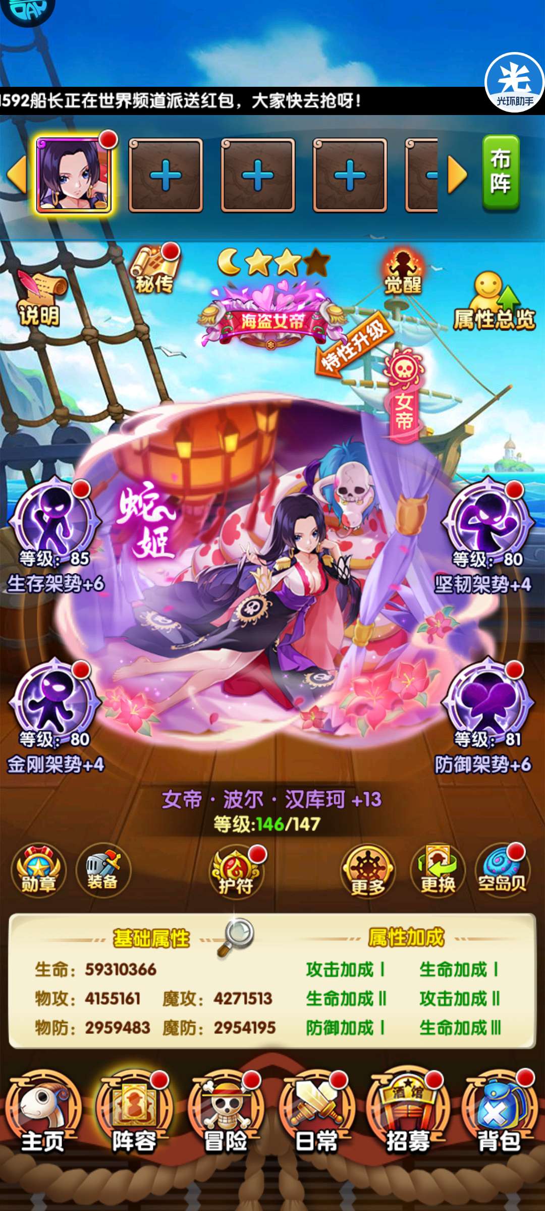 147级单人紫金金女帝,有皮有称号,蕾贝卡+6,金凯多虫+3,武装+5,满级纹章,有女帝破红