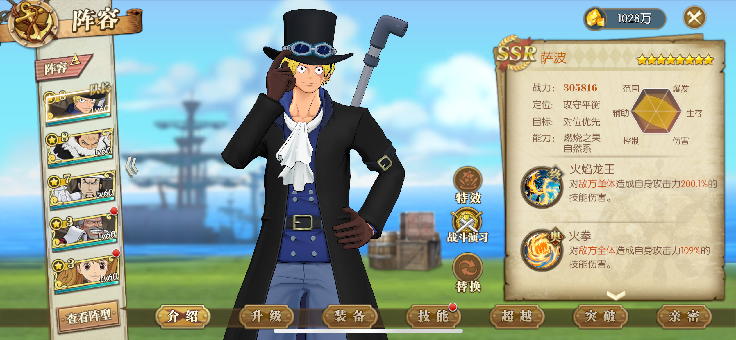 航海王燃烧意志:怀旧服【安卓官方】全皮草帽团差山治唐装,30多个八星,其他皮肤也很多,十级船,五套十,装备除游侠都有一套双速
