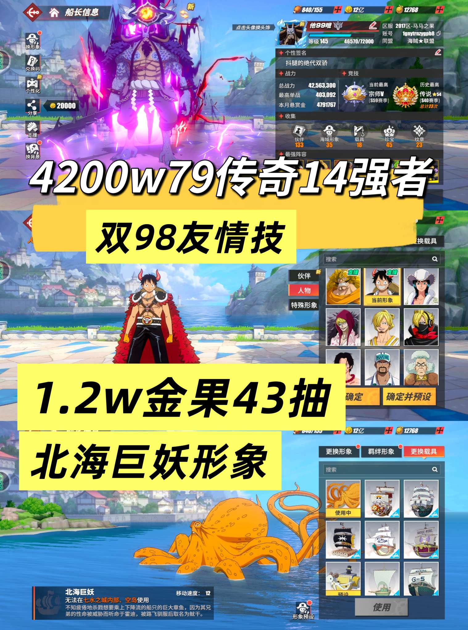 5000w78传奇12强者,最强98路飞友情技,4000金果110抽,伙伴多,竞技场专属新世界鹰眼,