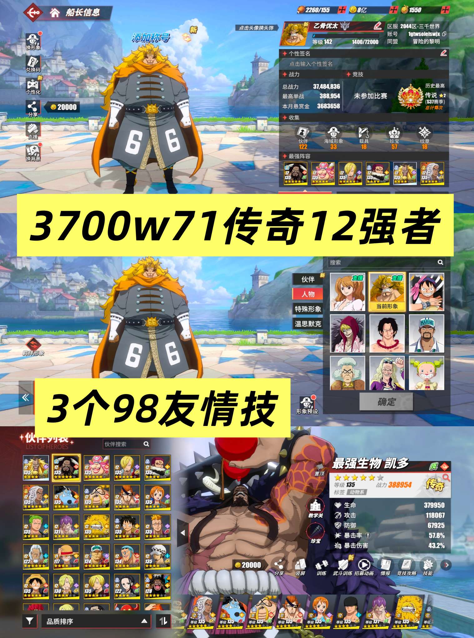 3700w战力71传奇12强者号,3个98友情技,热门角色全,伙伴图鉴进度高,资源多,账号安全,安卓