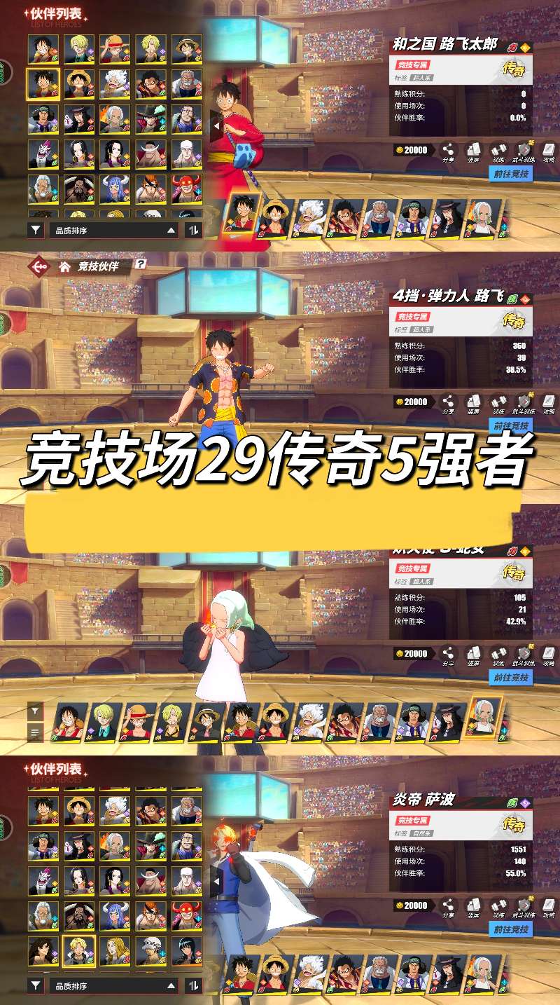 竞技场29传奇5强者,和路飞、炎帝萨波、炽天使蛇女、尼卡路飞等,账号资源多,战力高,伙伴全,安卓43