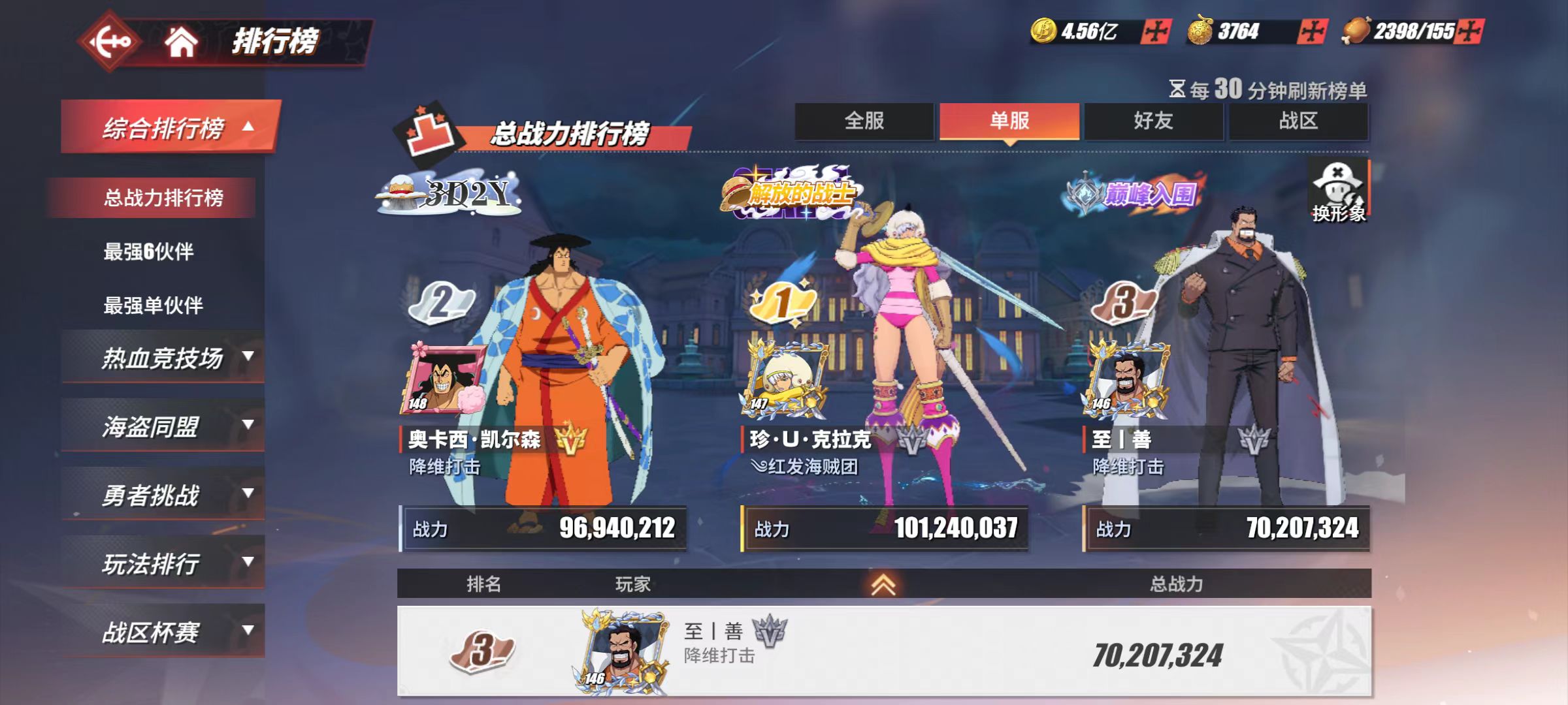 7935万战力。尼卡路飞83传奇15强者。3个98友情技。1万3金果。23艘船。单战最高60.5