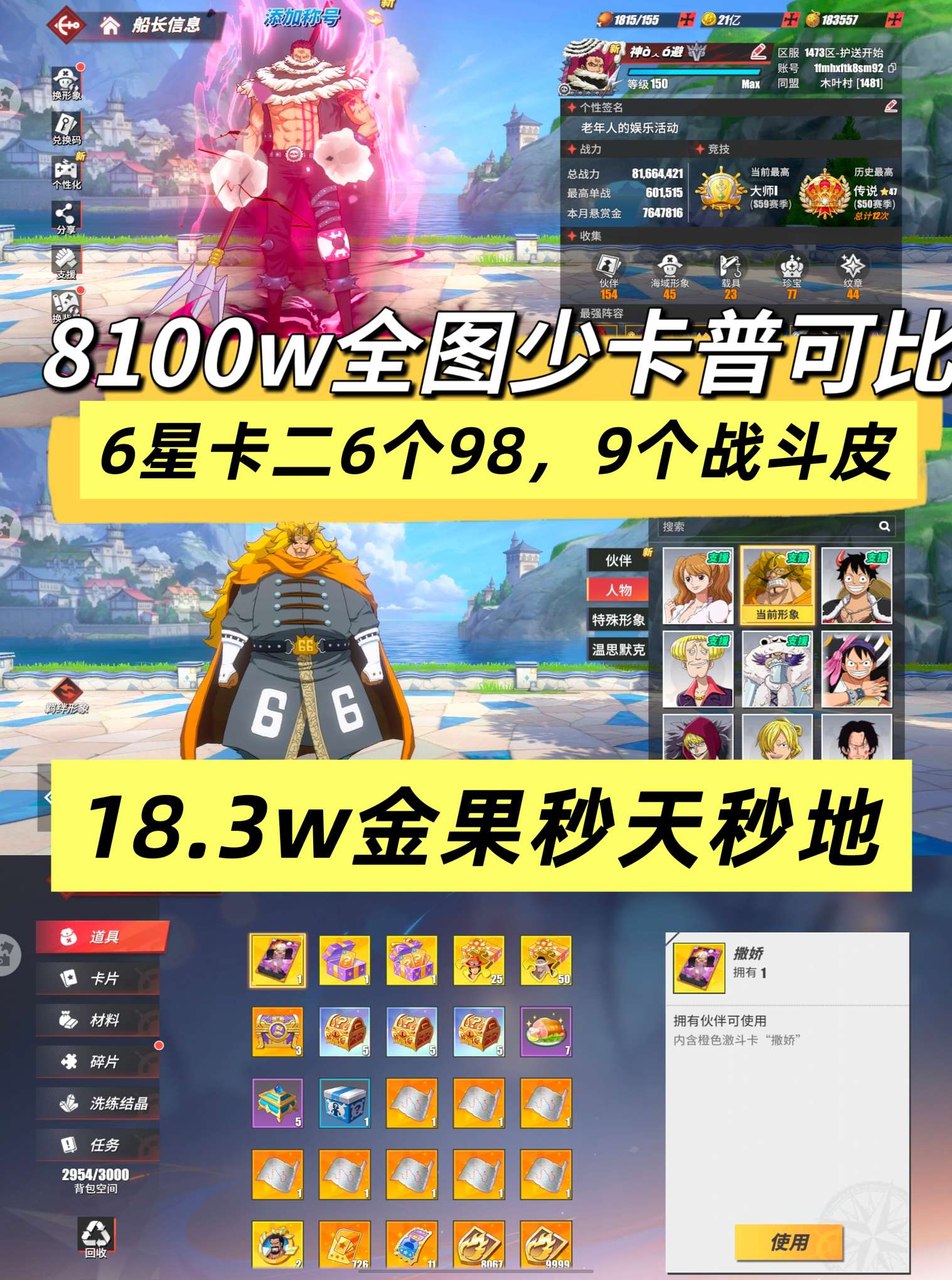 神船8100w18.3w金果全图少卡普可比,6个98友情技,9个战斗皮肤老白,卡二,新世界女帝,文山