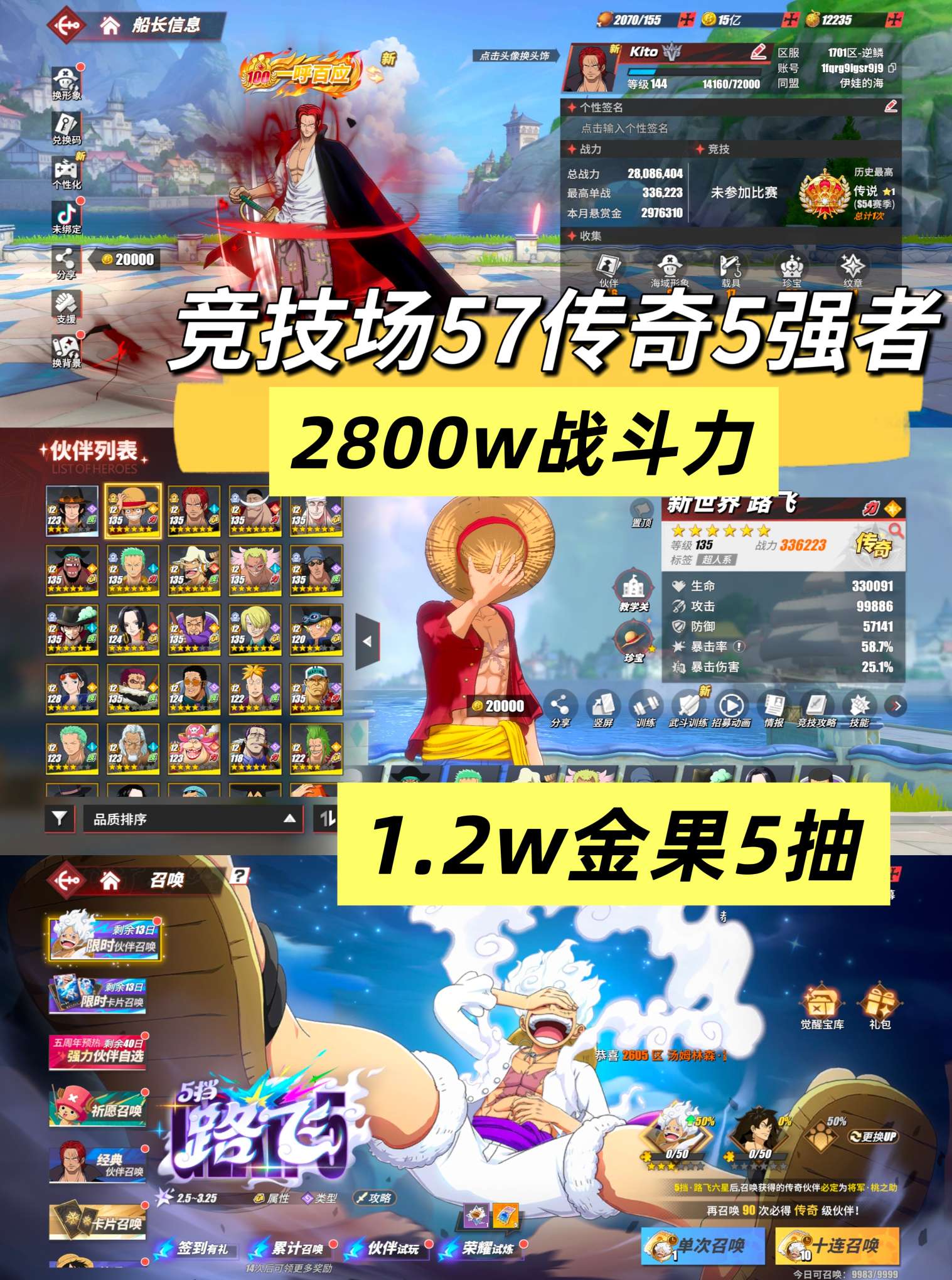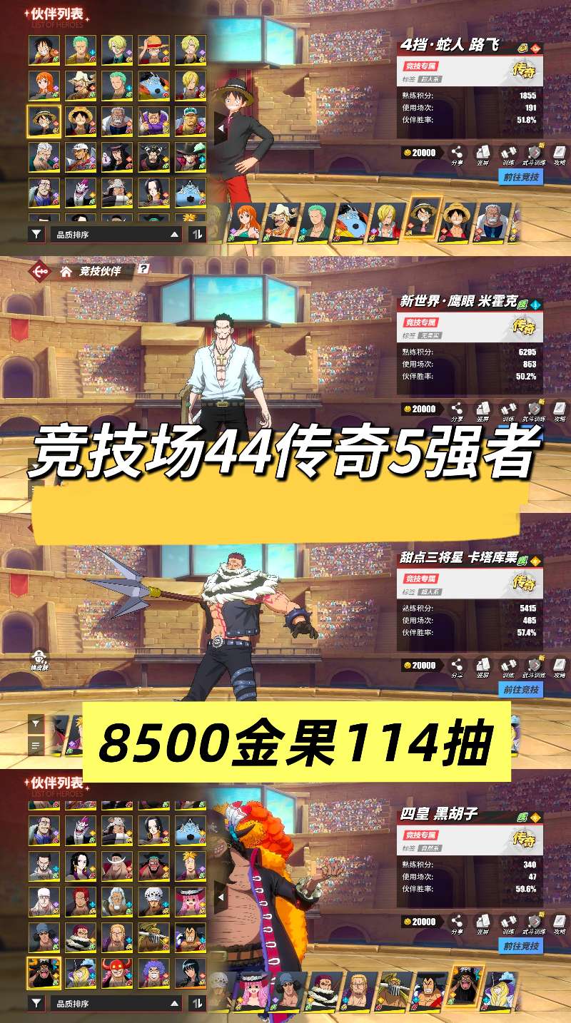 竞技场44传奇5强者8k金果107抽卡二,四皇黑胡子,新世界鹰眼,青年雷利,新世界鹰眼等官服版本苹果