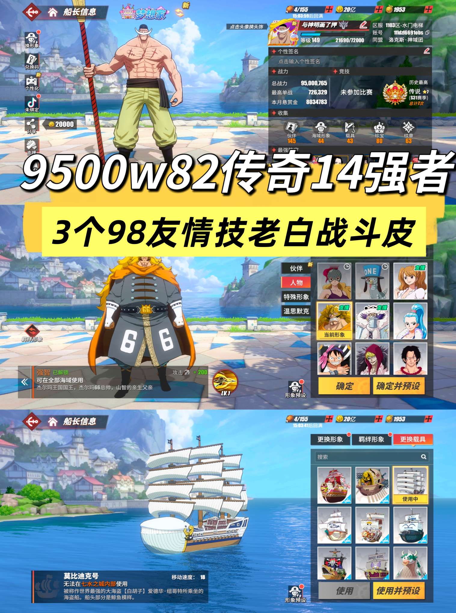 3神船9300w82传奇14强者3个98友情技,老白战斗皮肤, 白星剪刀船坞形象,官服版本