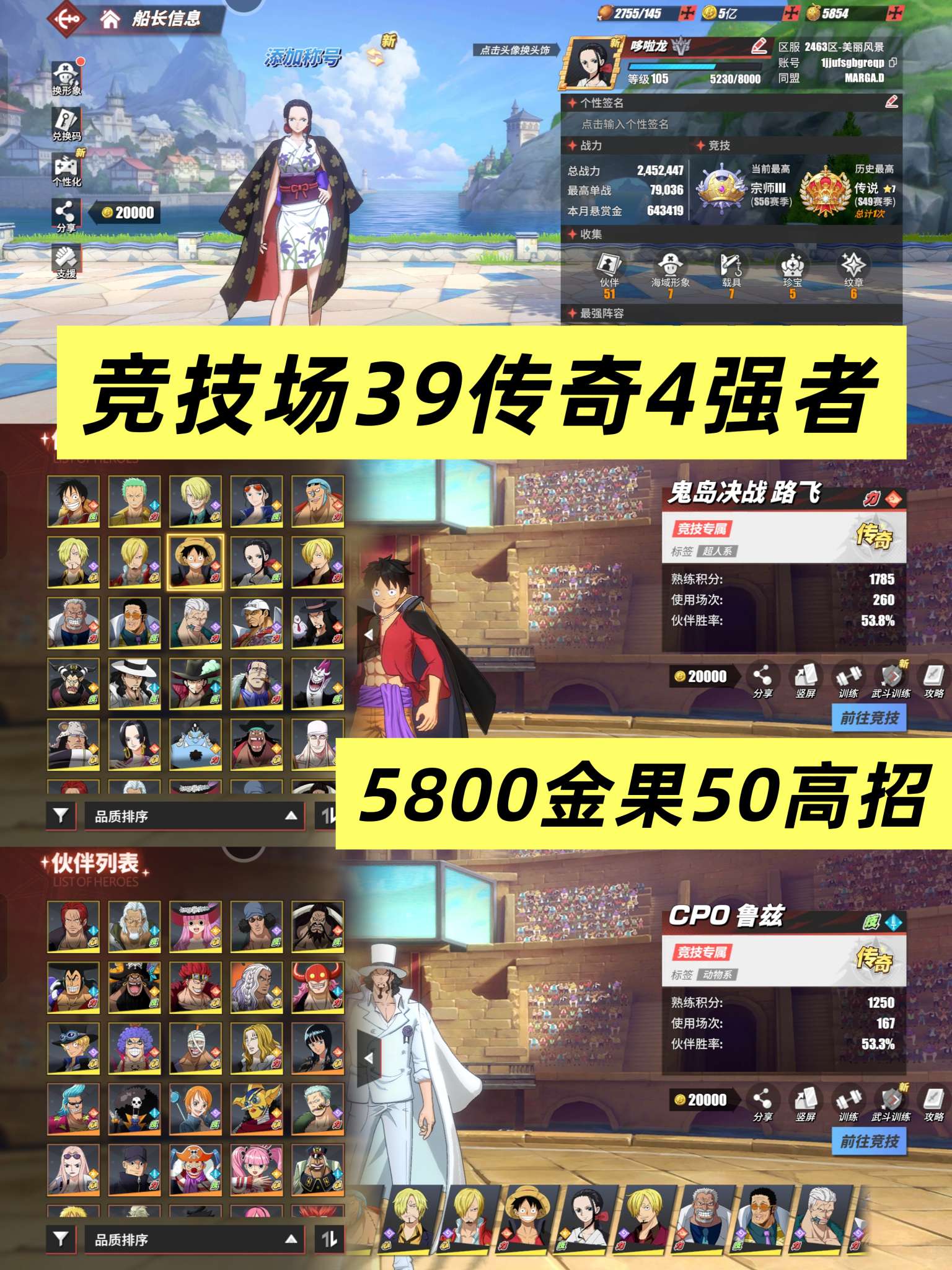 竞技场39传奇4强者,5800金果50高招,鬼路cp0,四皇黑胡子,基德,魔神山治,文山,凯多,库赞