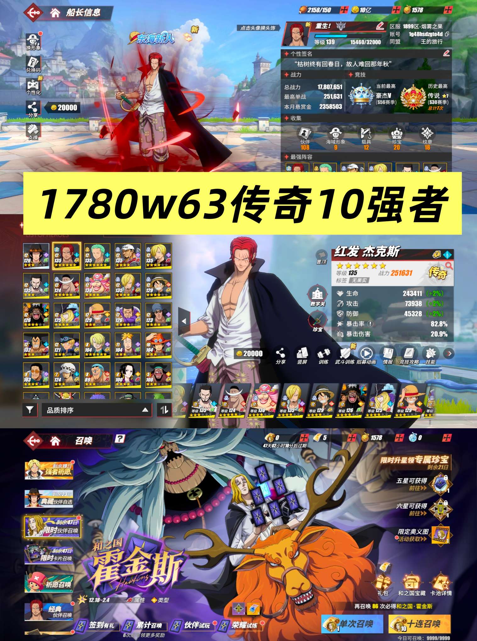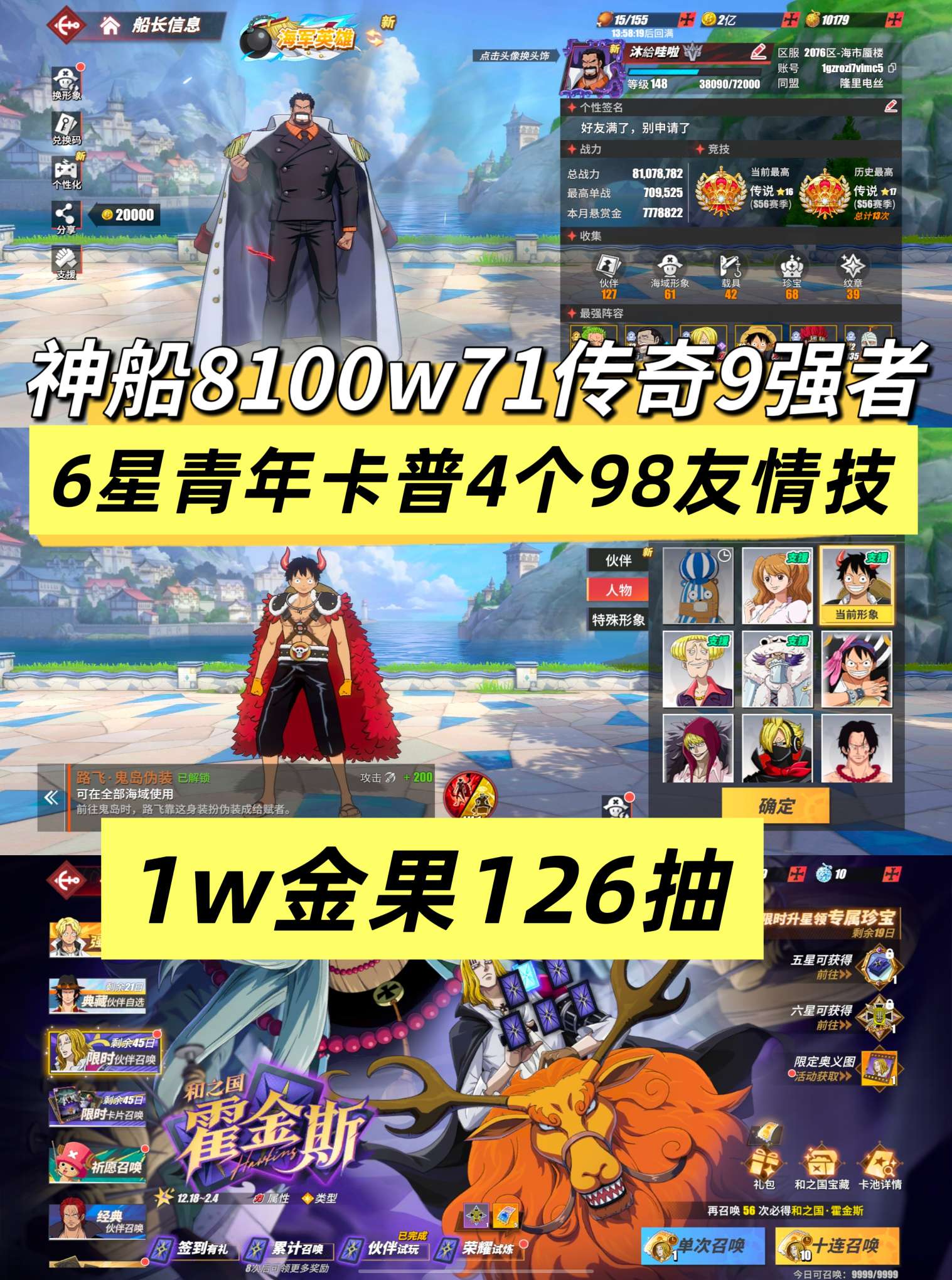 神船8100w71传奇9强者4个98友情技,青年卡普,单站最高70w,五星珍宝鬼路,和佐,十字公会老