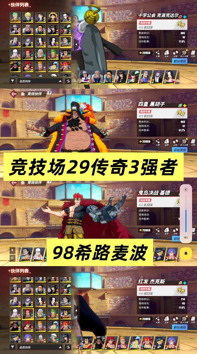 竞技场29传奇3强者,98希路麦波,四皇黑胡子,红发杰克斯,伙伴多,资源丰富,安卓苹果互通,账号安全