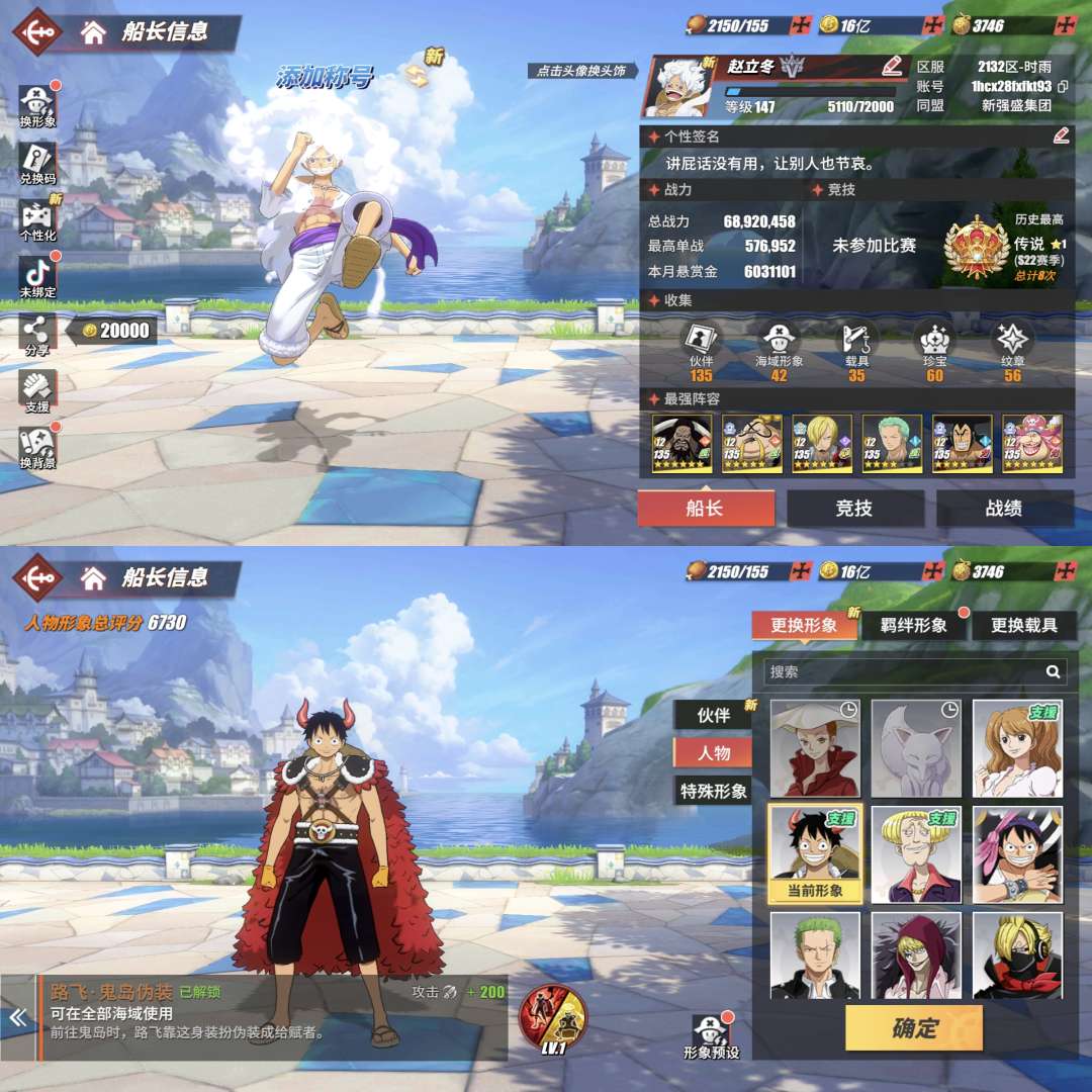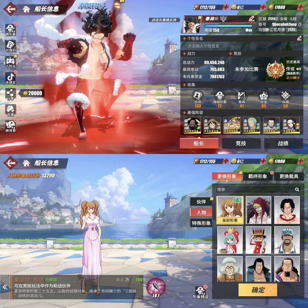 6892万战力。3个98友情技。雷神船35艘船。尼卡路飞76传奇12强者。6星珍宝凯多 红发 大