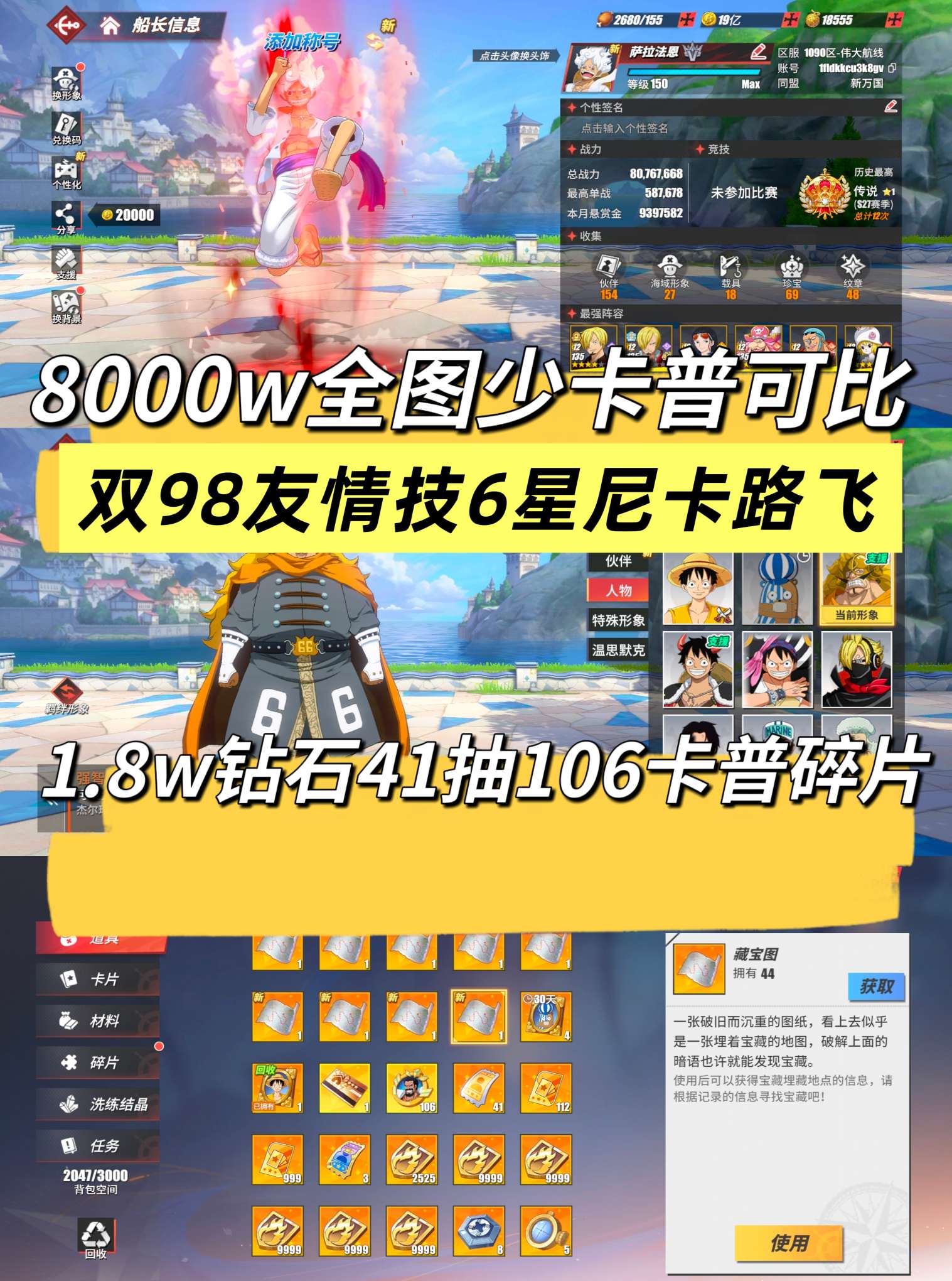 8000w全图 少卡普可比 双98友情技 6星尼卡路飞 1.8w金果, 41抽 106卡普碎片 账号