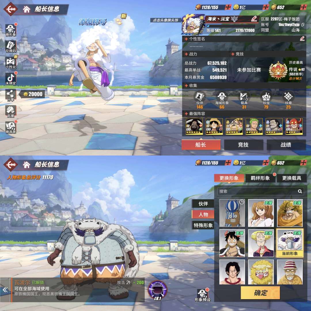 6752万战力。尼卡路飞82传奇14强者。5个98友情技。1神船31艘船,礼服山治皮。顶上白胡子皮
