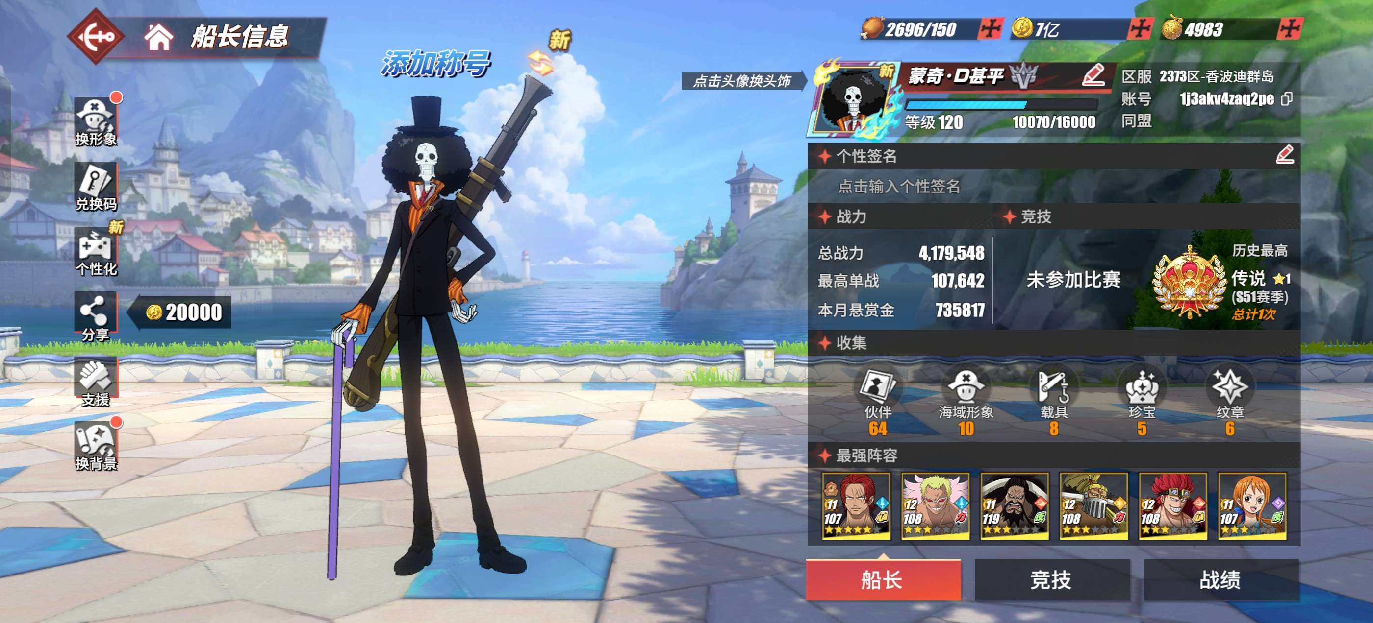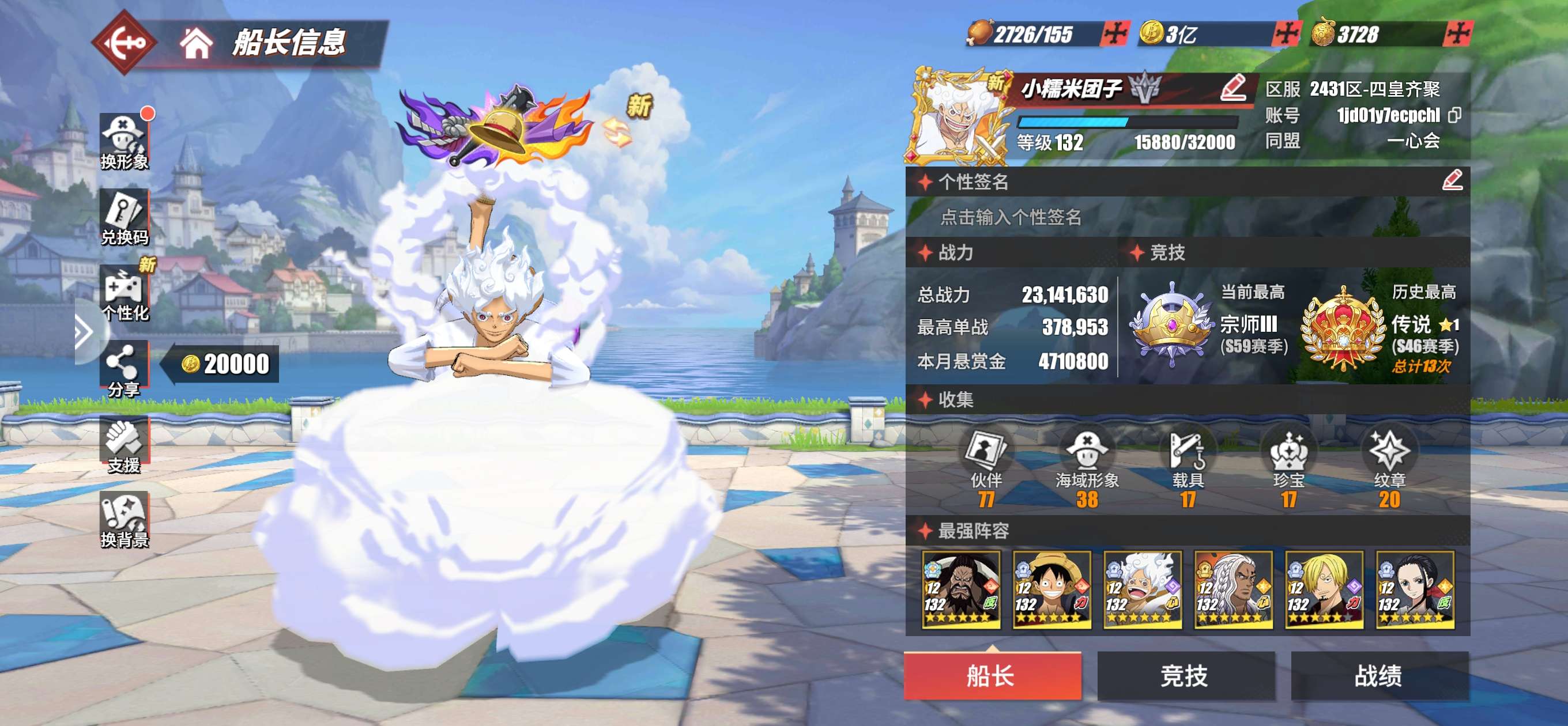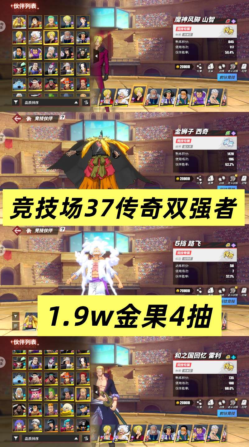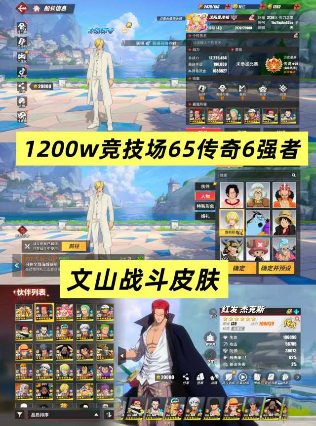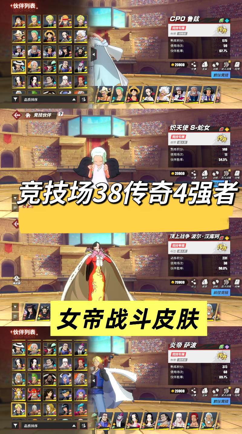 竞技场50传奇6强者魔神山治,十字公会老沙,鬼岛基德,四皇黑胡子,炎帝萨博,白衣路奇等1360w战斗